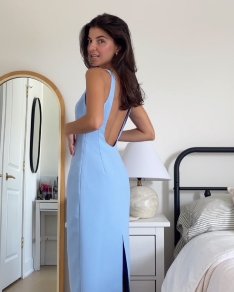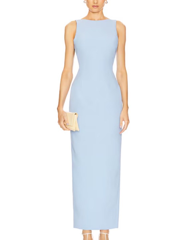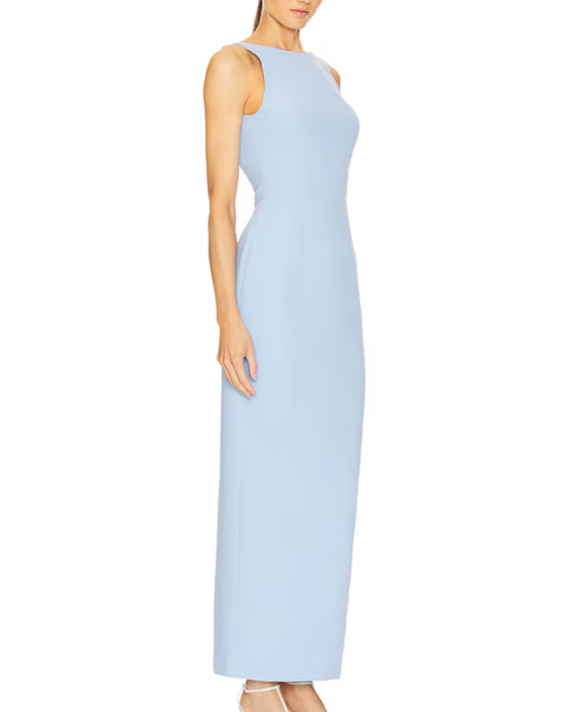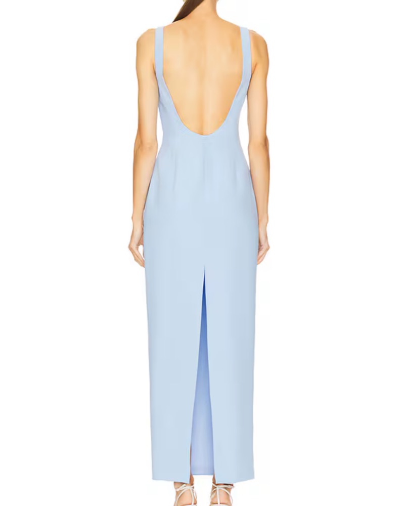 “Marbella” maxi dress from Amanda Uprichard. Stunning low back, boatneck, and cornflower blue color. Tons of compliments and even better in person.