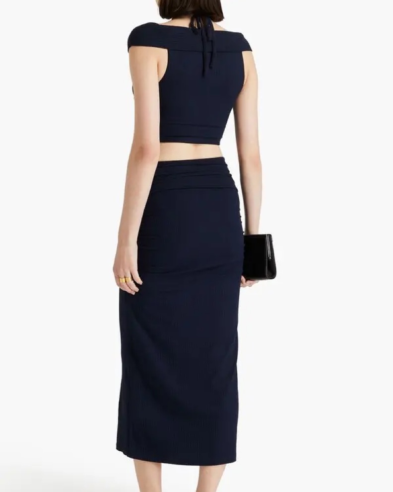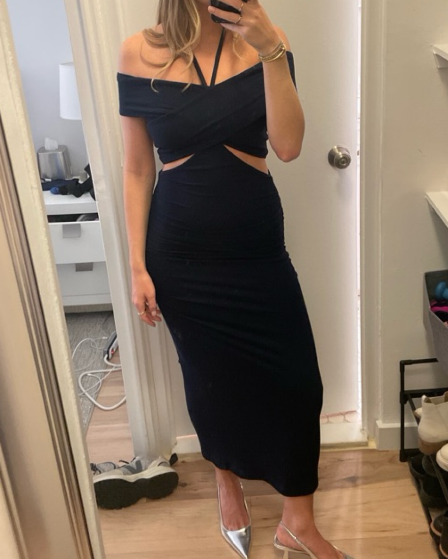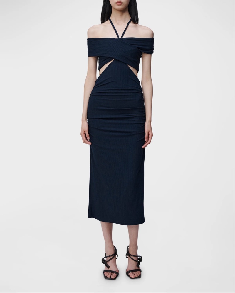 Navy blue ribbed bodycon off the shoulder with cutouts midi dress