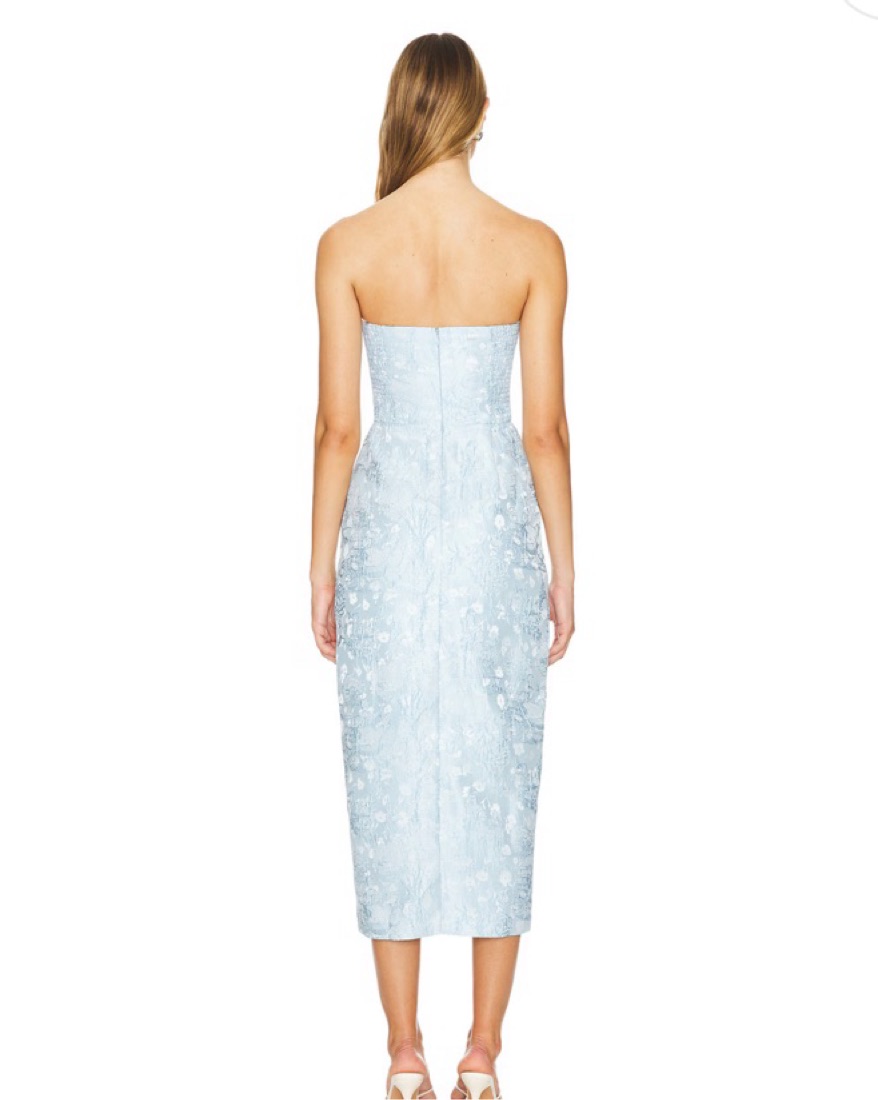 The Ivy Dress in Blue by Amanda Uprichard is the perfect mix of elegant and classy. With its strapless fit, subtle floral jacquard, and sleek side slit, it’s a timeless choice for any dressy occasion. Has light boning on the top!