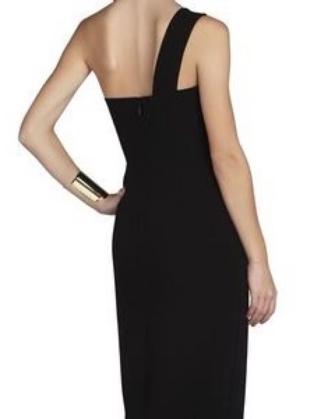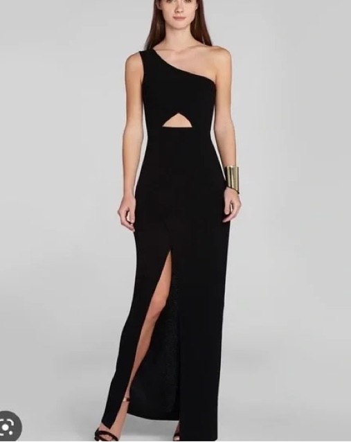 Sleeveless. One shoulder neckline. Column skirt with front slit and cut-out at waist. Hidden back zipper with hook-and-eye closure. Partially lined. Boned bodice. See size and fit tab for lengths. Imported. Lengh has been altered to fit 5'2 with heels.