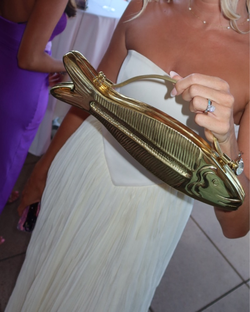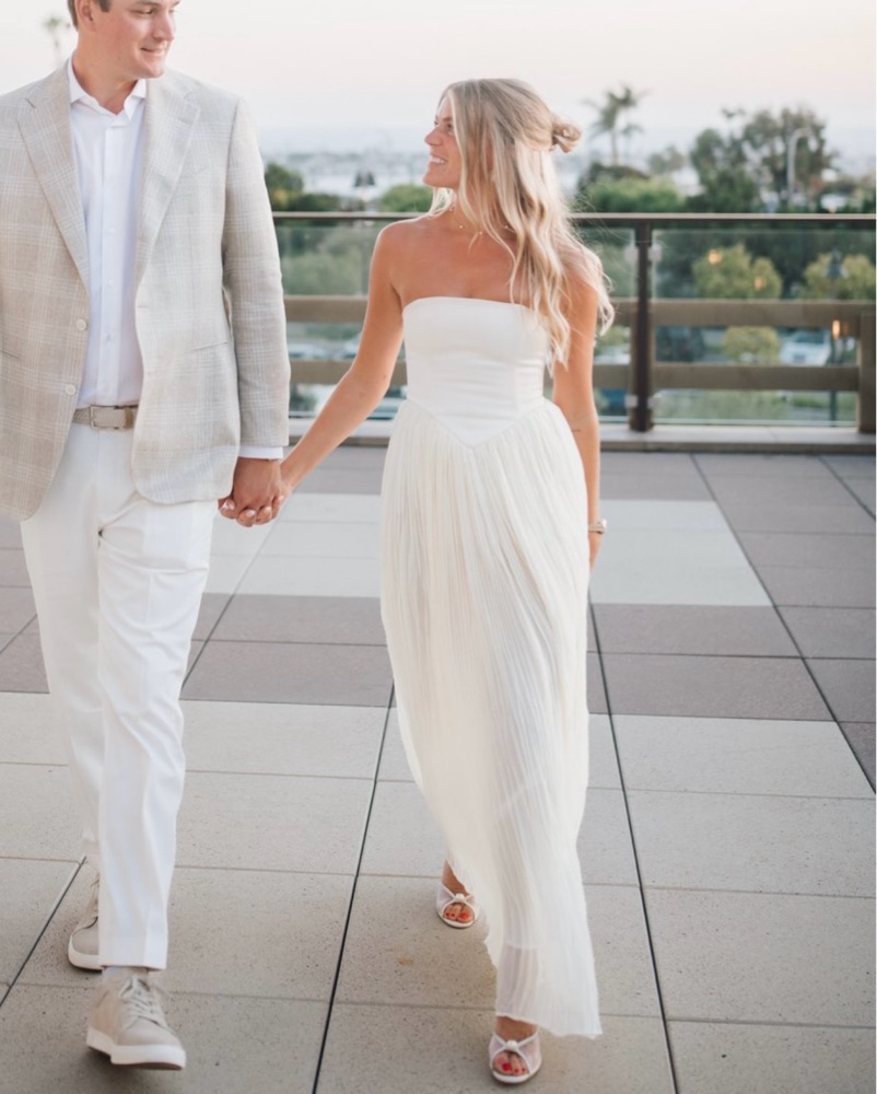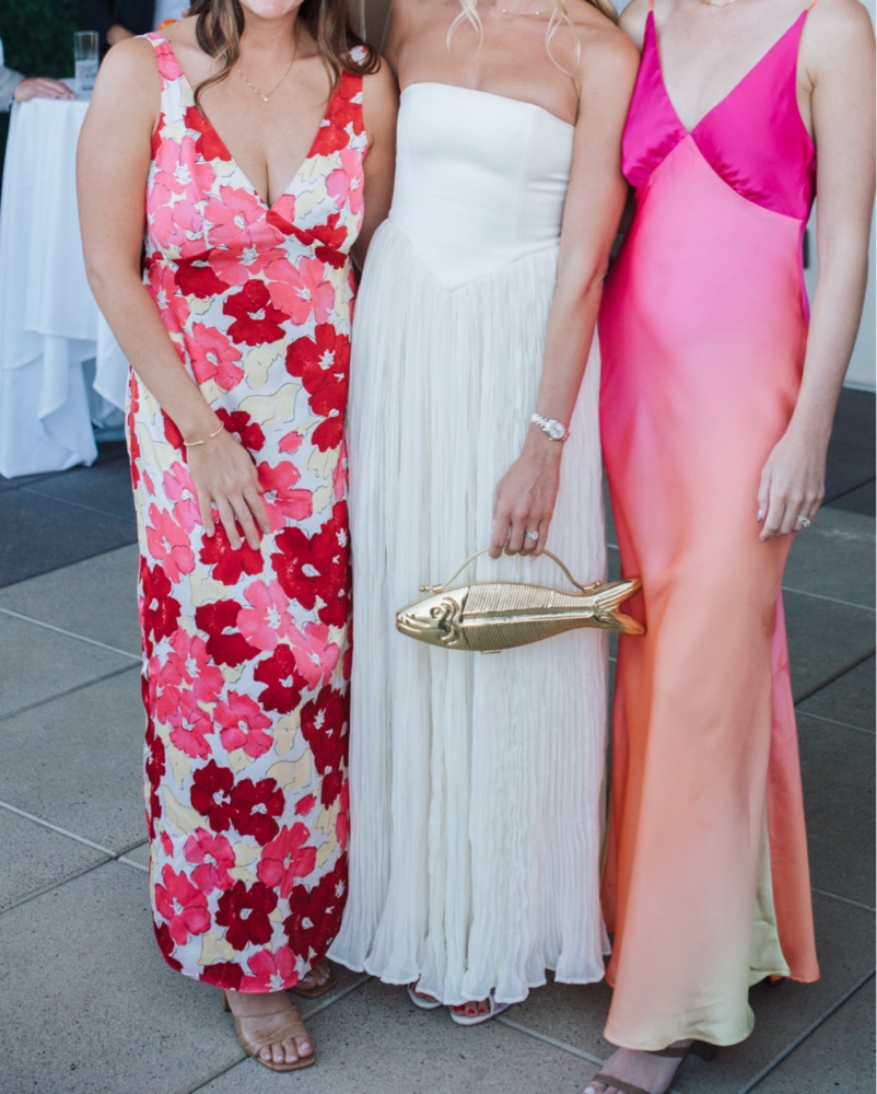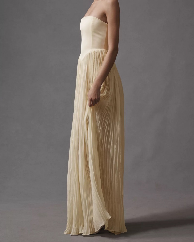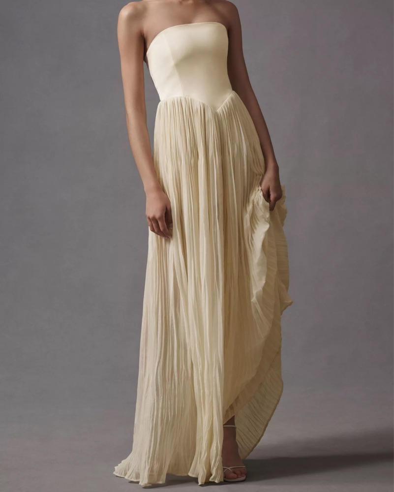 This dress is from Anthropologie and it’s PERFECT for a wedding event! Much more ivory in person. The top is so flattering and the material is so unique. Love love love this dress. Color is “buttercream”
