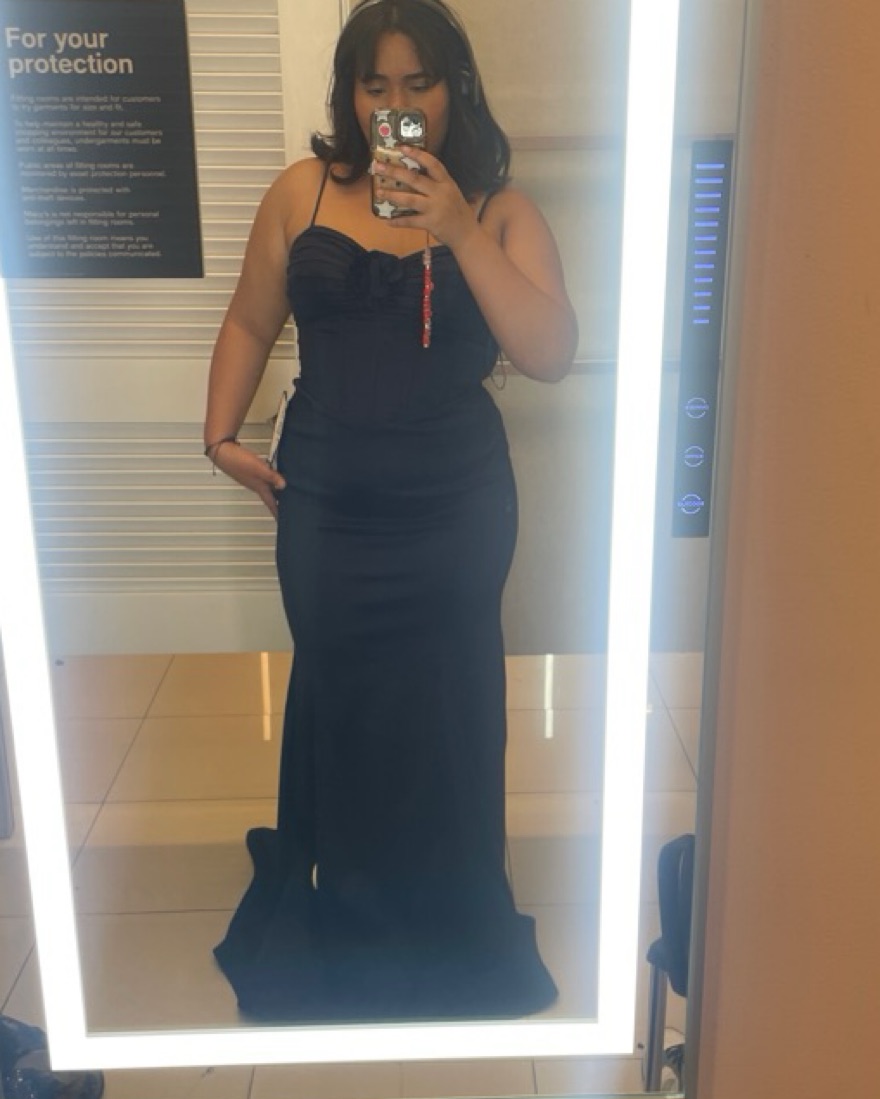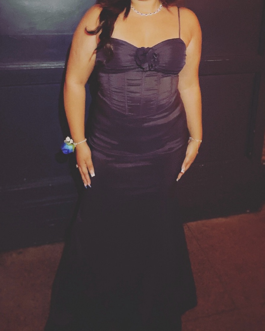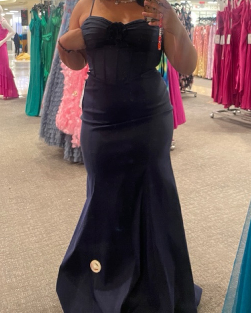 Long navy blue prom dress , it’s open in the back. Size 11!!