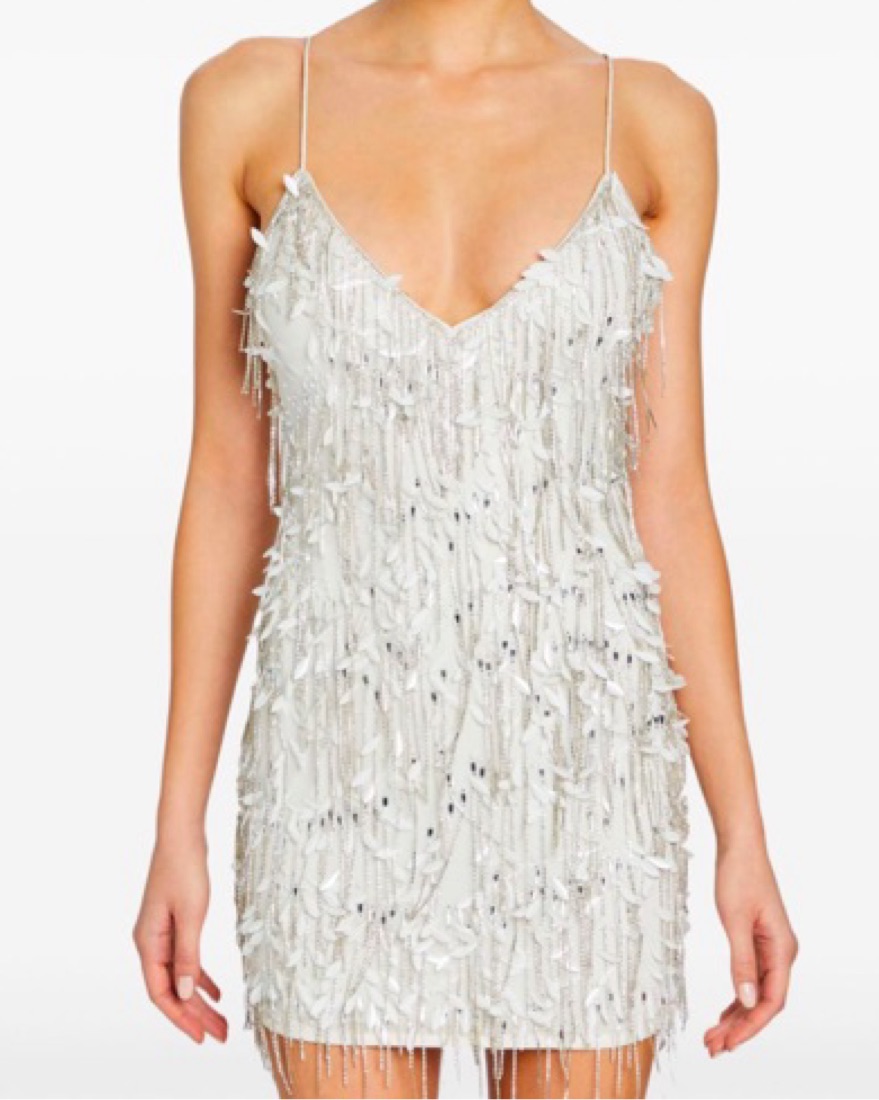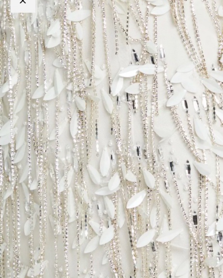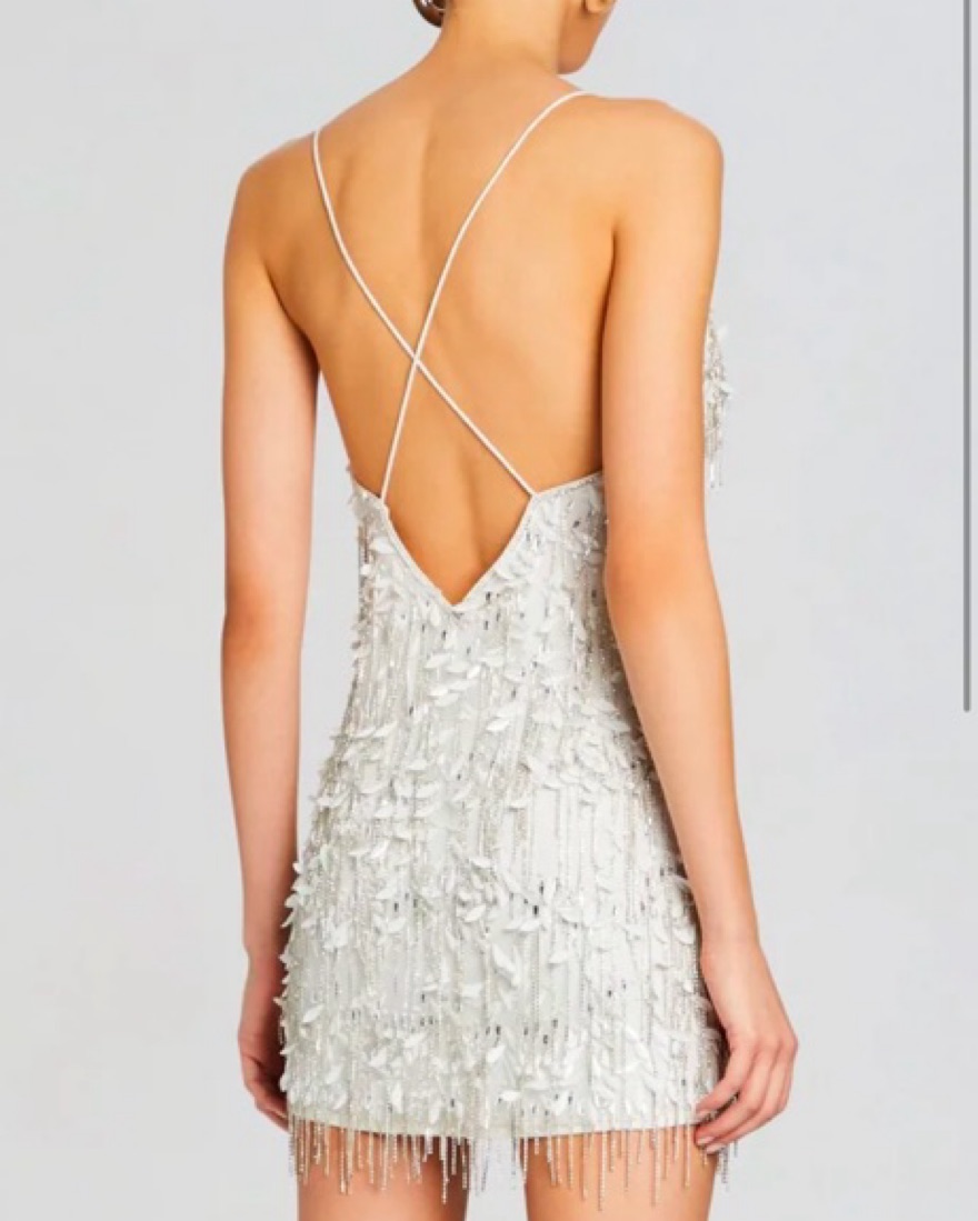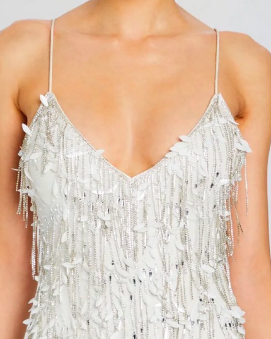 sequin feather-like embellishments | fringe chain sequin details | open back | white/silver | tags: bride, bachelorette, reception, winter white, glitz, glam, bridal, sparkle