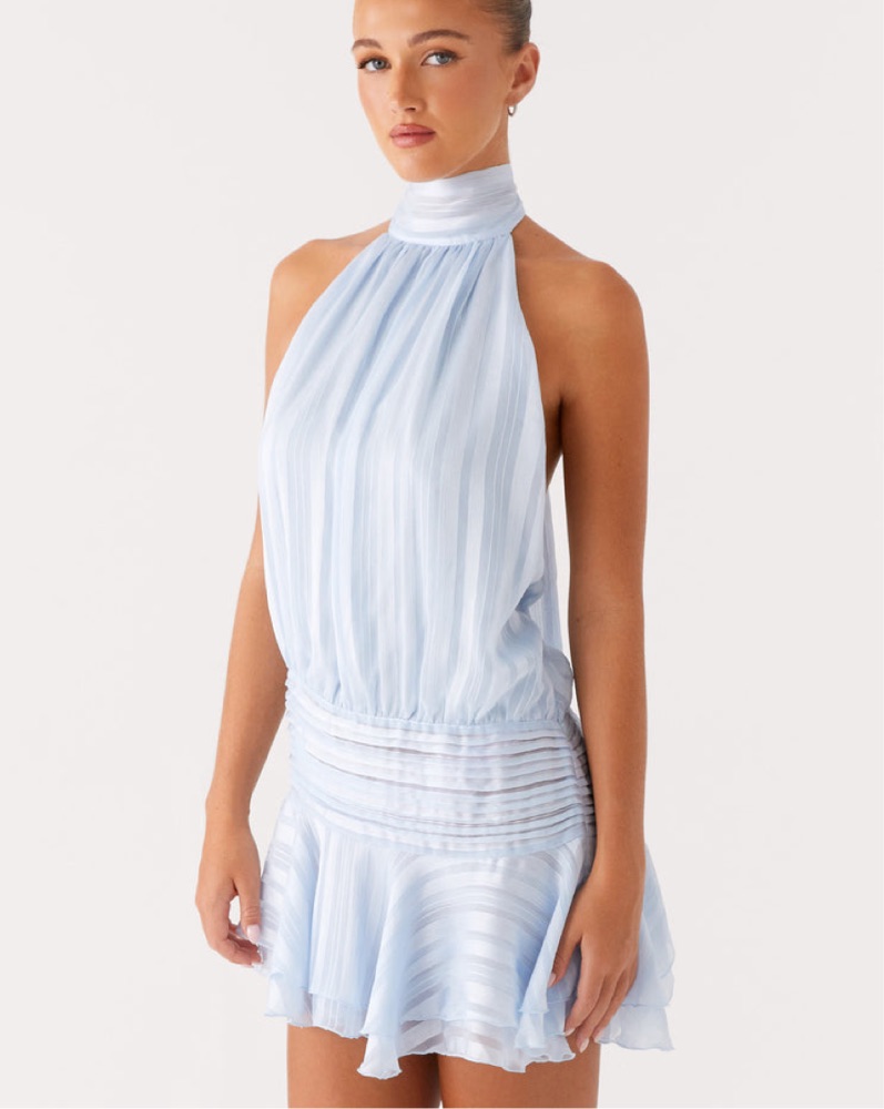 This chic sky-blue mini dress is perfect for a summer evening out with friends. The pleated details and halter neckline create a flattering, feminine silhouette.