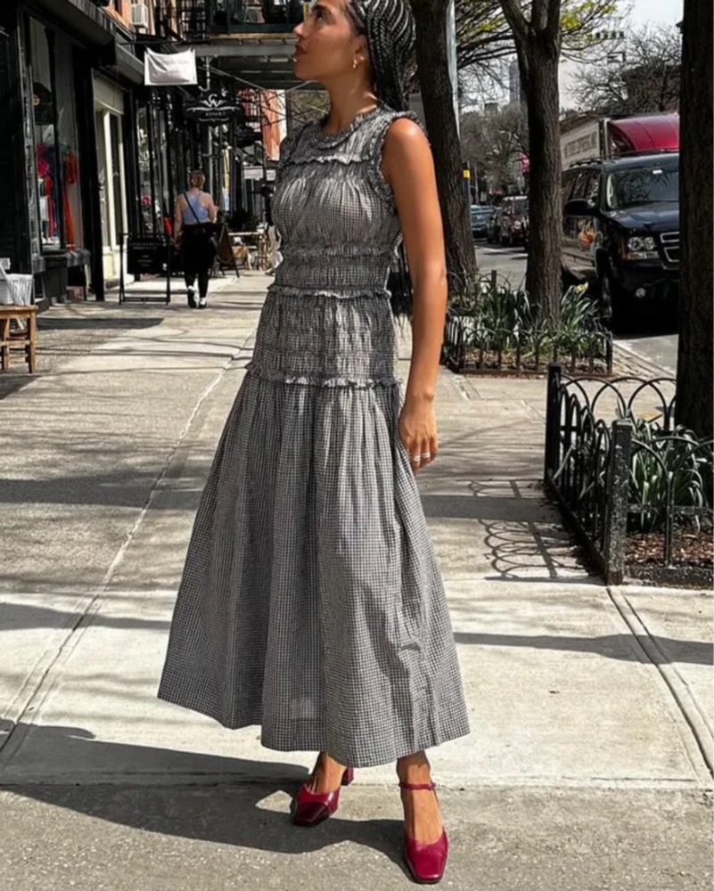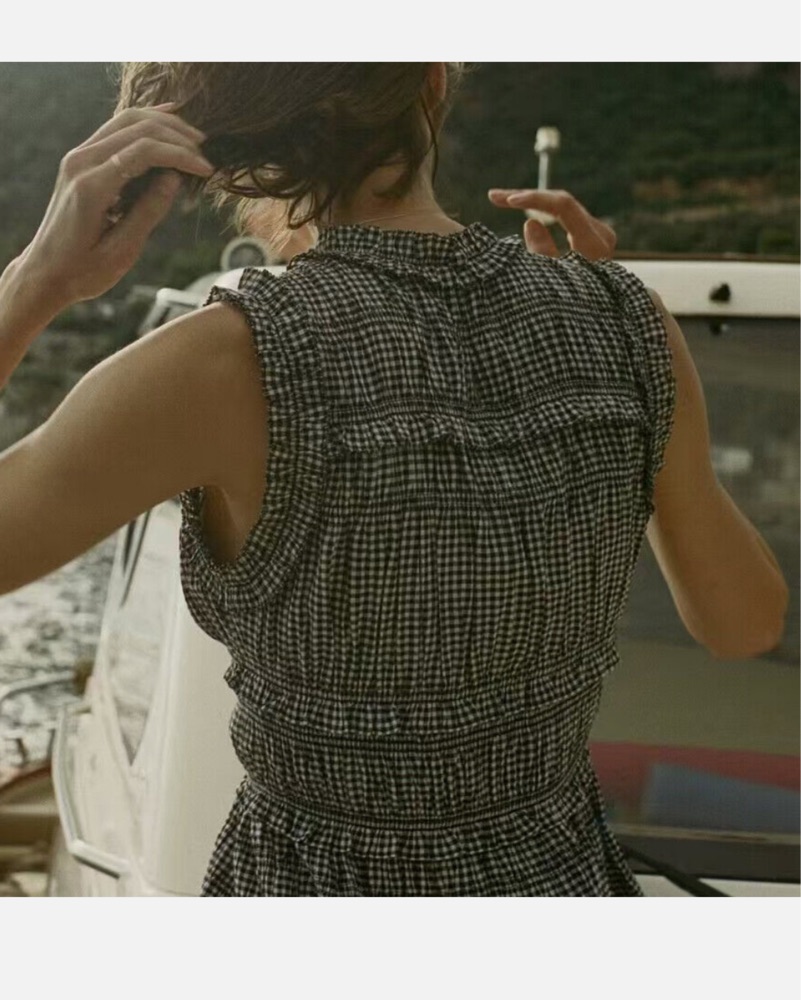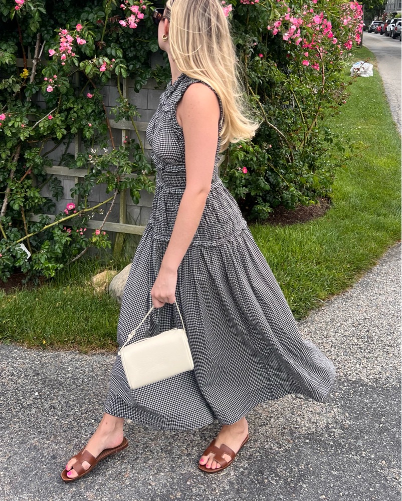 Black and white gingham Mallory dress by Doen. Super flattering.