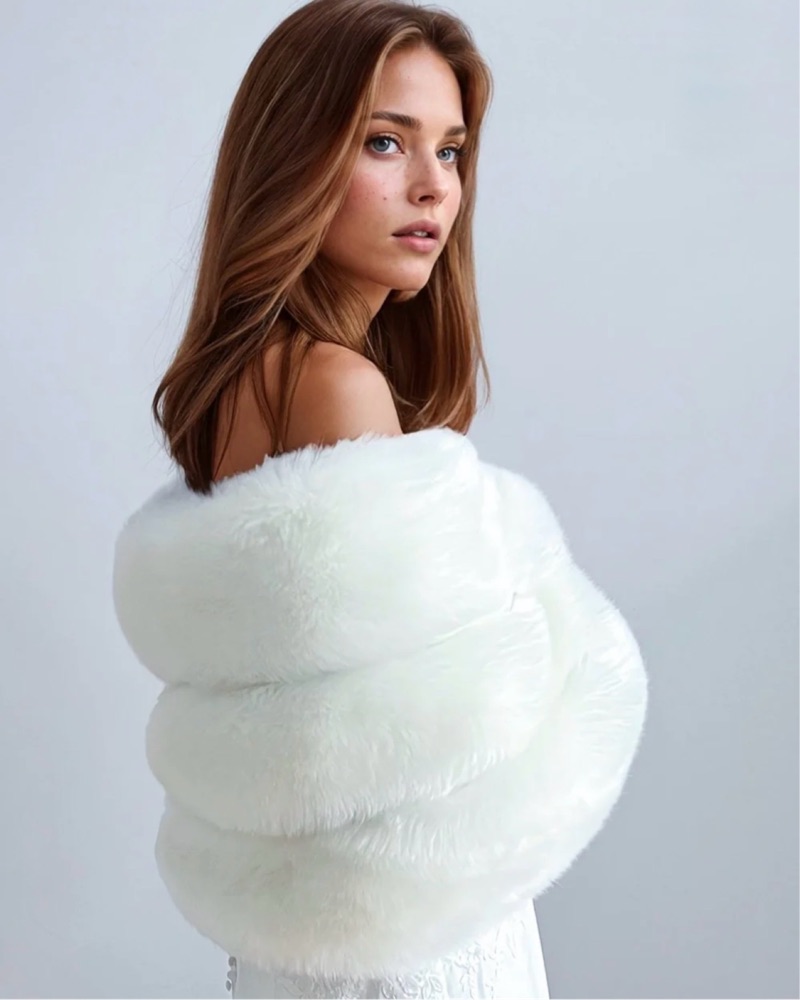 This stunning ensemble features a plush white faux fur wrap, perfect for a formal occasion like a wedding or gala.