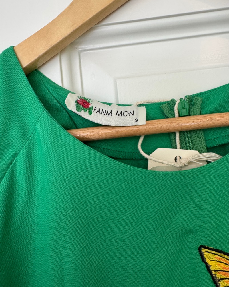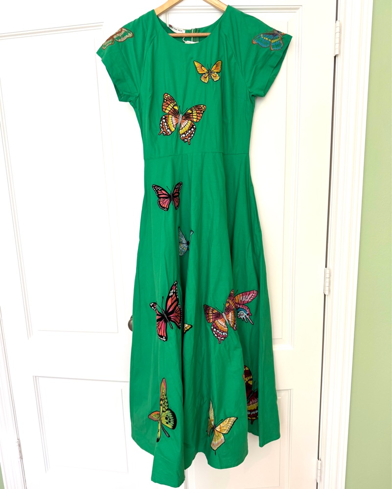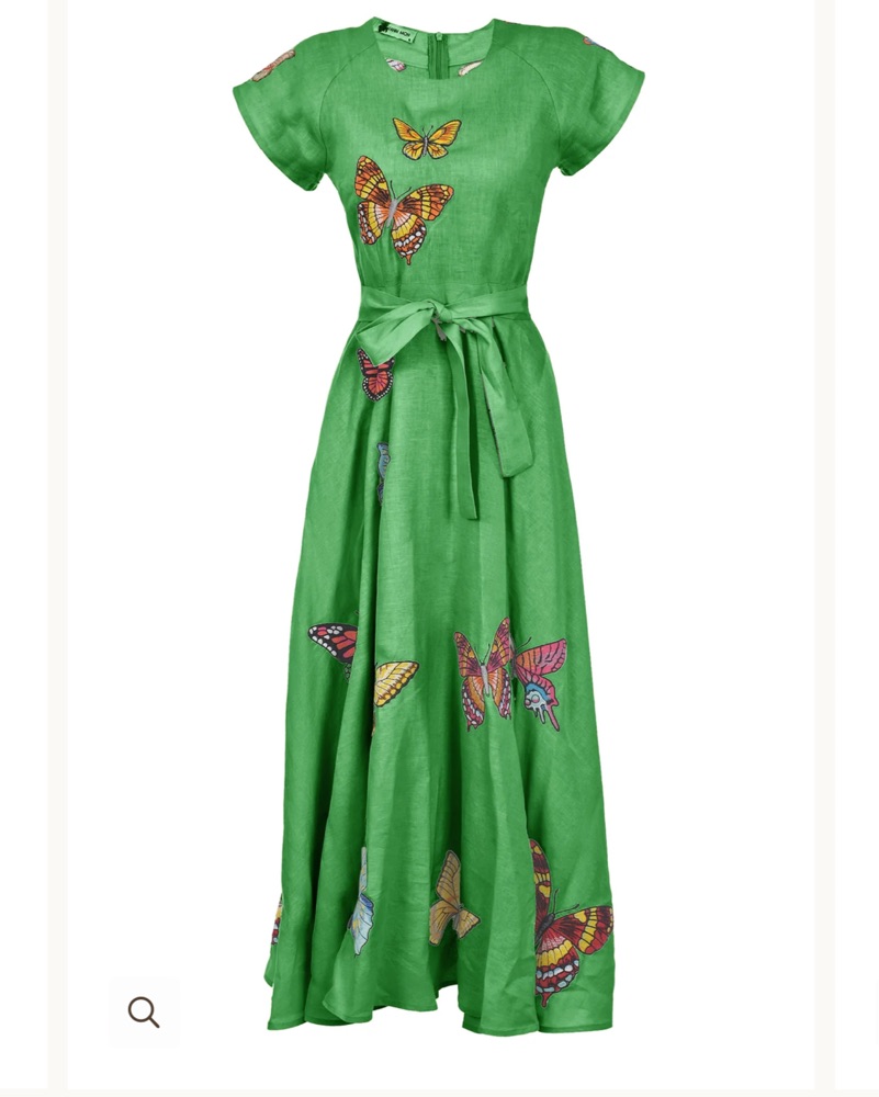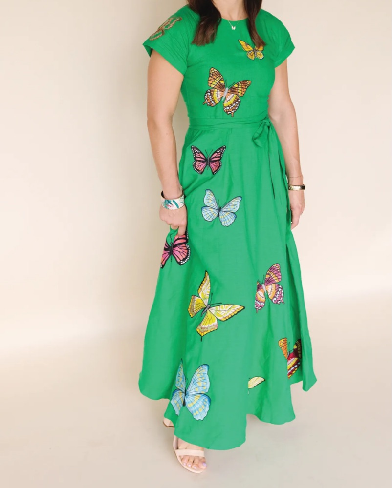 This green maxi sundress features elegant flutter sleeves and a classic crew neckline, perfect for wedding guest attire. The dress has gold butterfly accents. It is light and flowy linen material. Ties at the waist. New with tags.