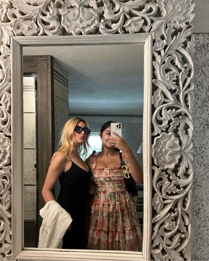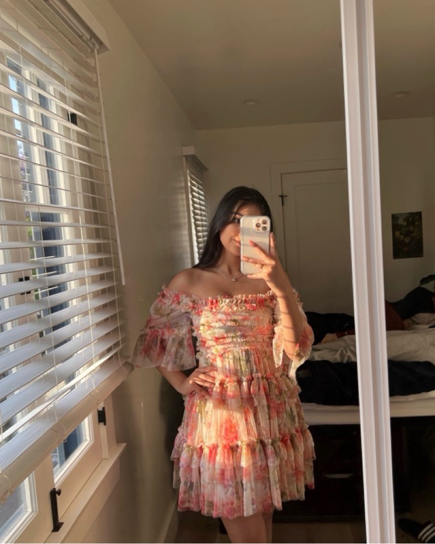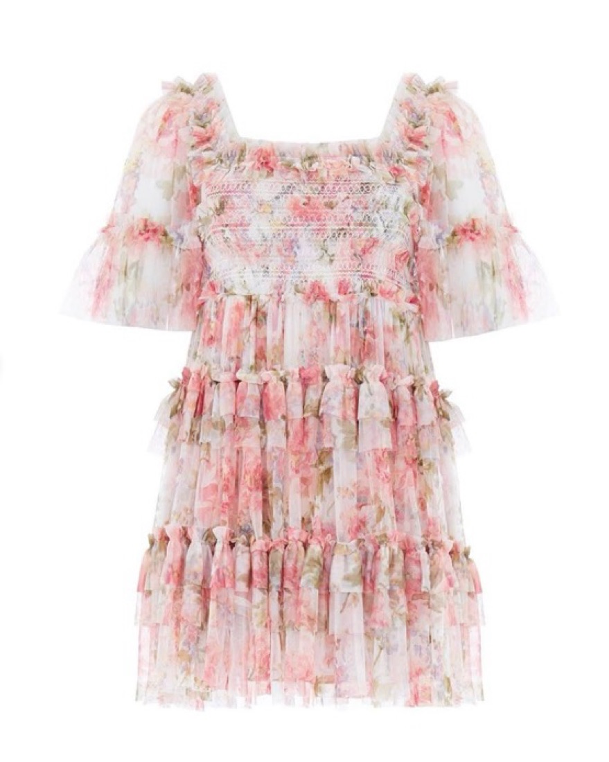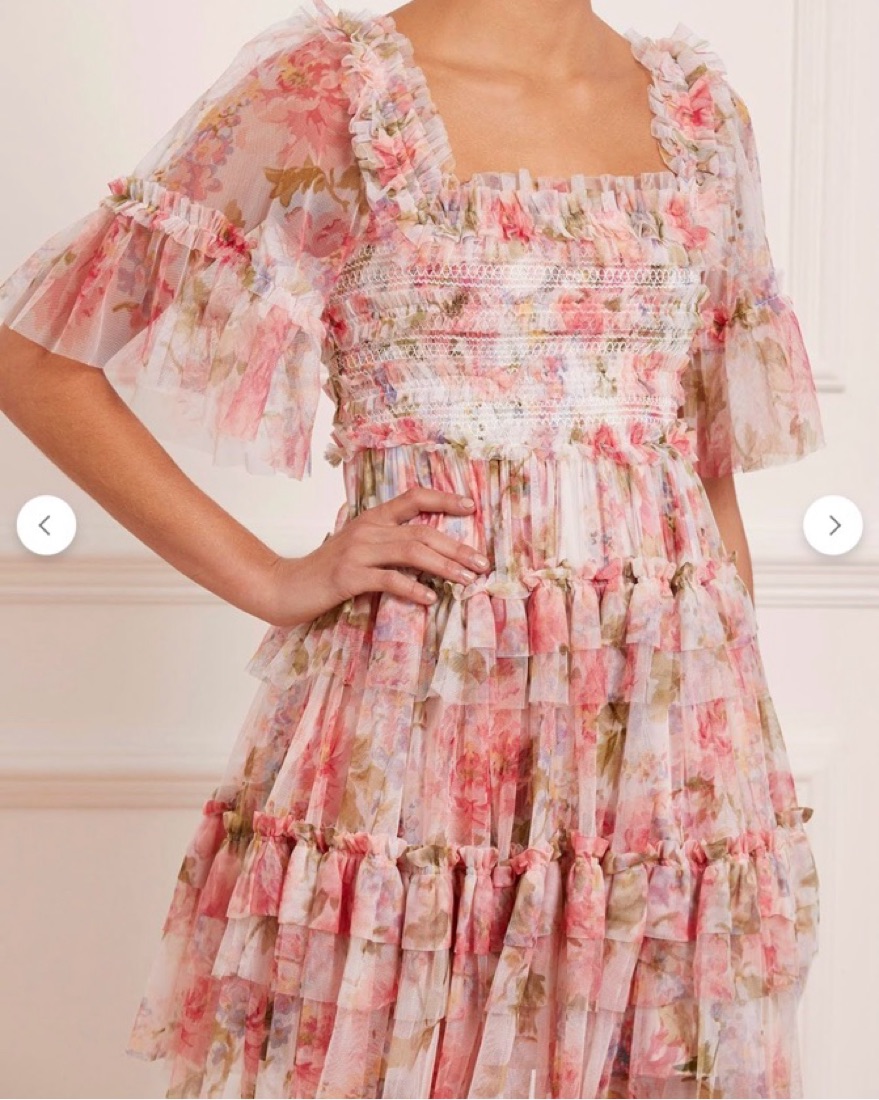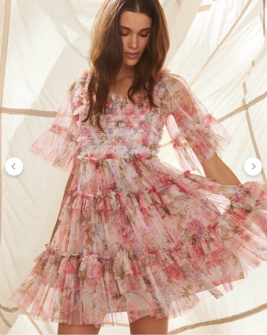 Cutest dress ever, pink/multicolored floral dress. It’s meant to be worn on the shoulder, but you can try off the shoulder too. Made of tulle and fully lined (sleeves are unlined).