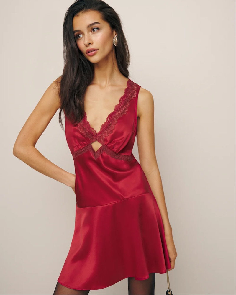 This ravishing red satin dress with delicate lace trim exudes sophistication and femininity, making it an ideal choice for a glamorous evening event or special occasion. Sold out and perfect for the holidays!!