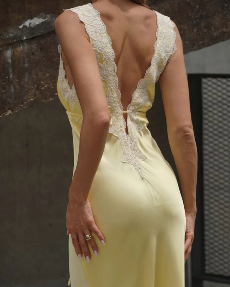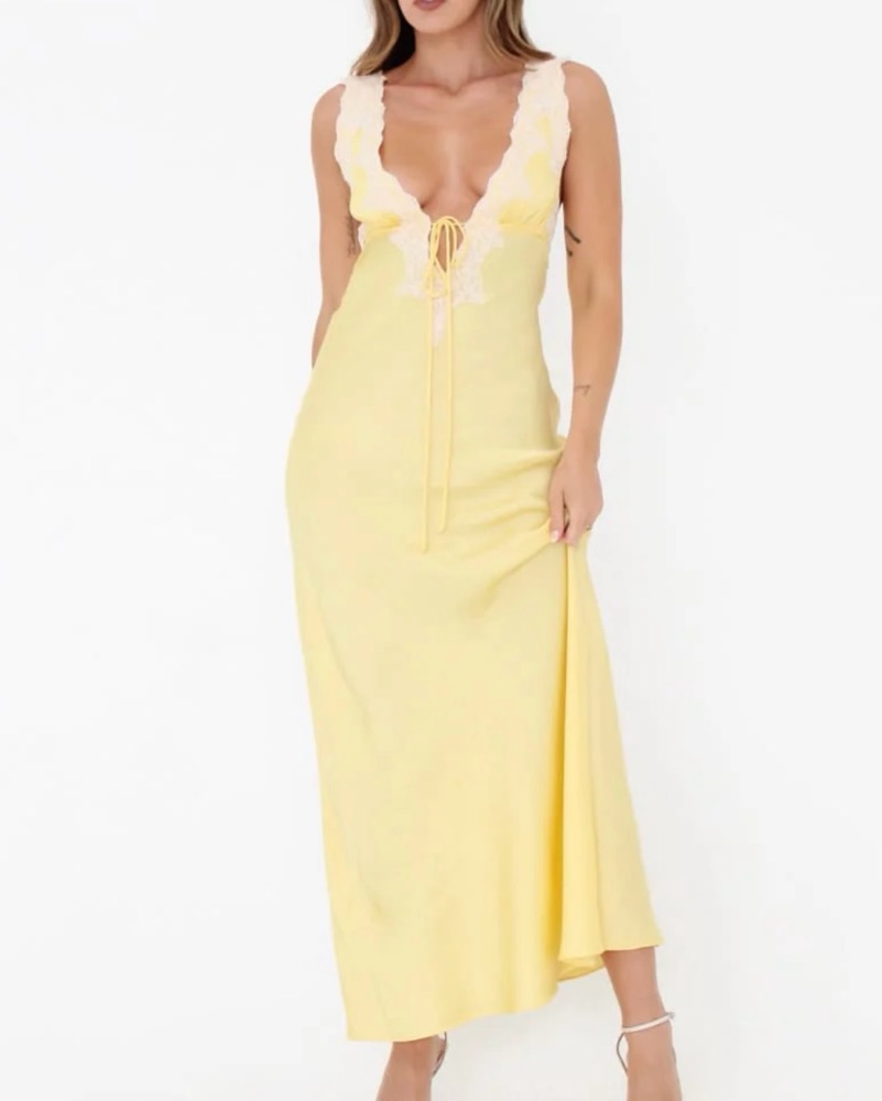 Plunging neckline with adjustable tie Contrast lace trim at neckline and armhole Low back Midi length Stunning butter yellow maxi dress