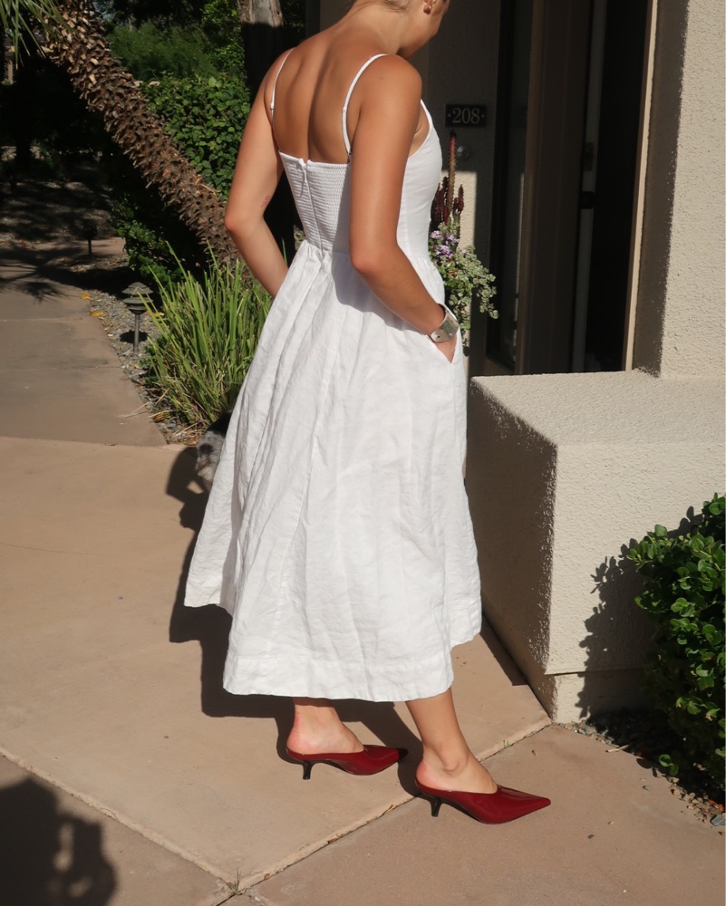 Technique linen dress - size small! White in color from Aritzia. Has pockets. 100% linen- This is a V-neck fit-and-flare dress with a smocked back and adjustable straps. Perfect for Easter, brunch, wedding weekend, chill park days, etc