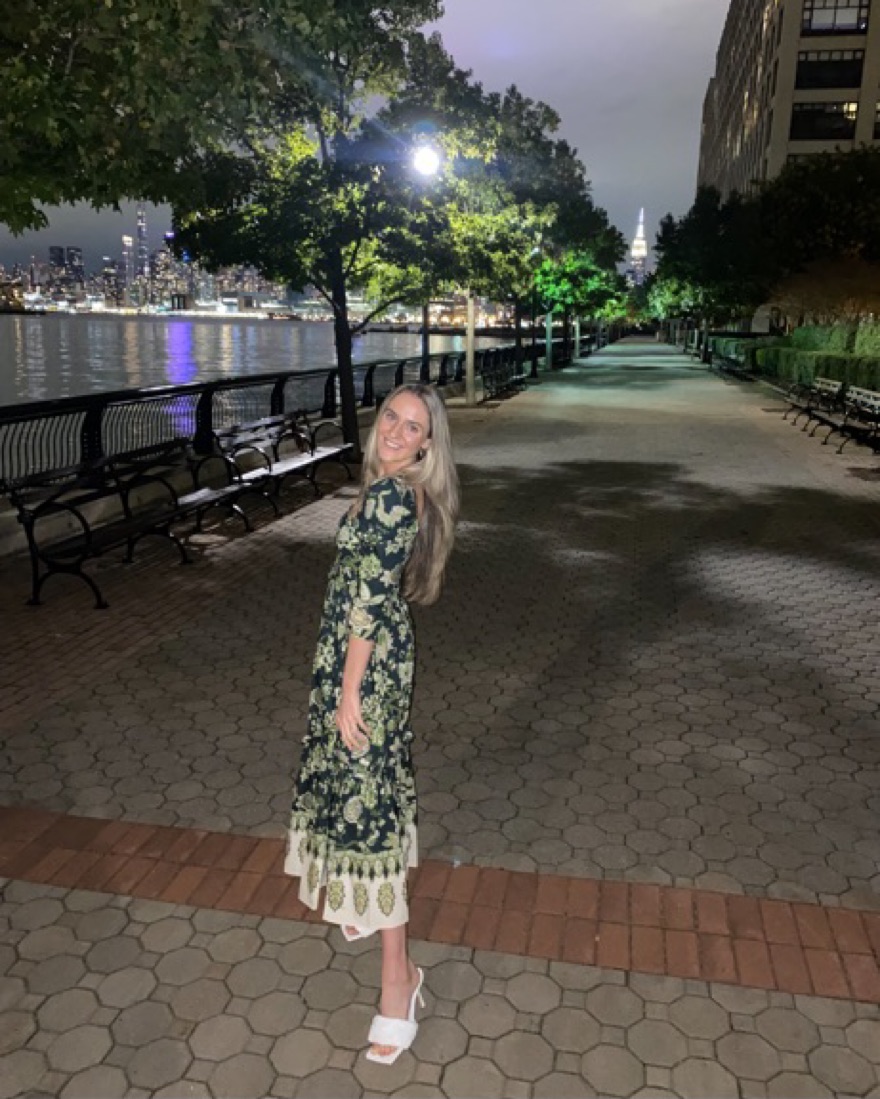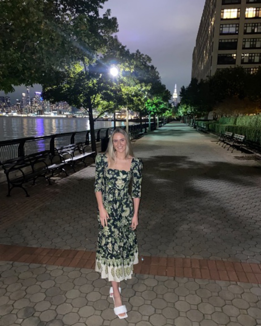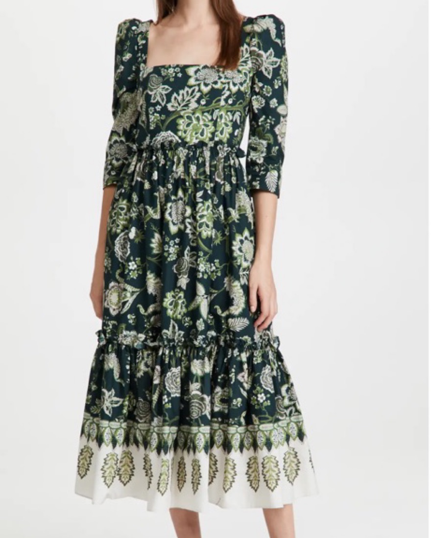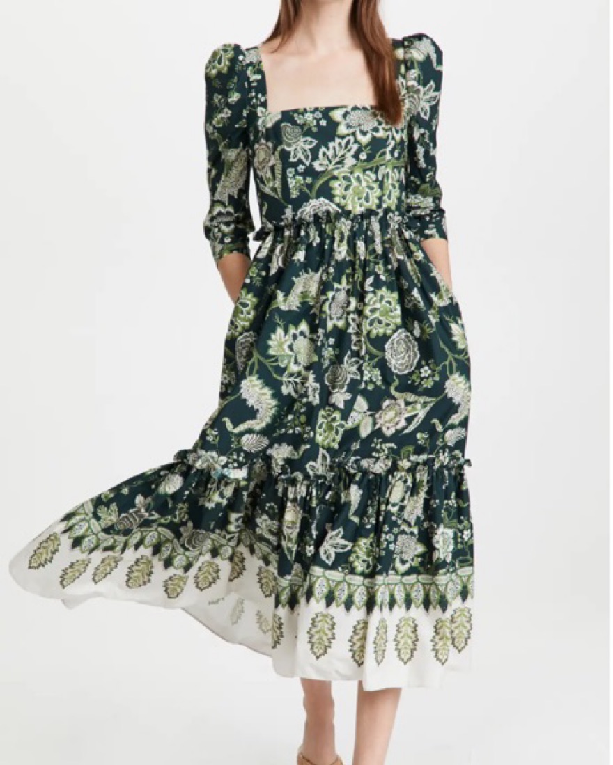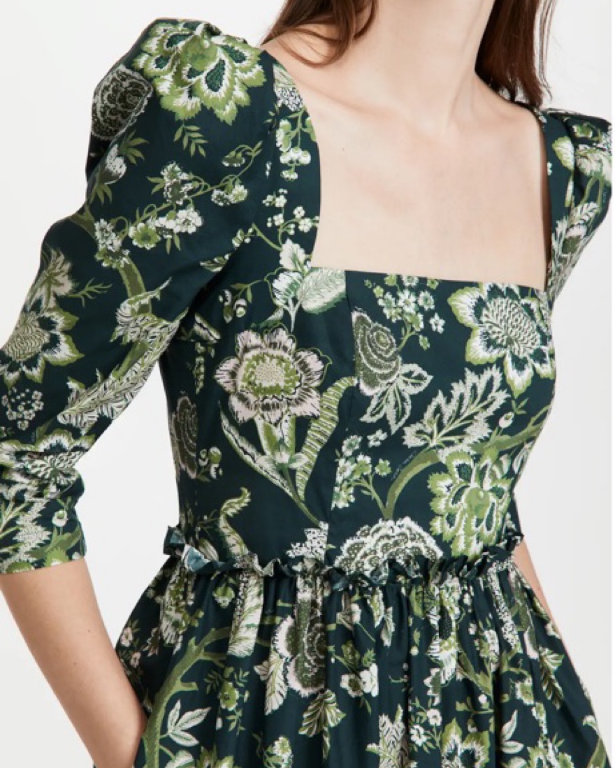 Deep-green patterning accents this occasion-ready Cara Cara dress, which has a sleek fit through the empire waist before finishing in a voluminous skirt. A square neckline and puff shoulders add extra romance to the silhouette.