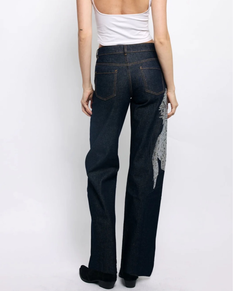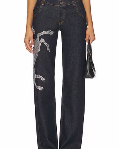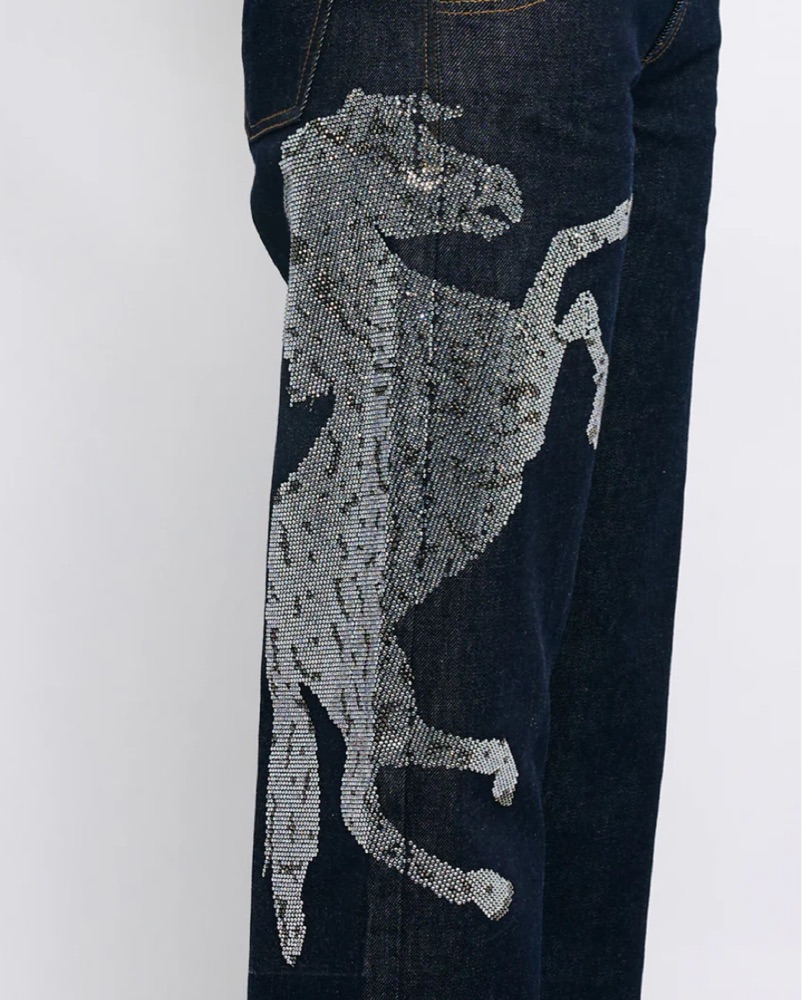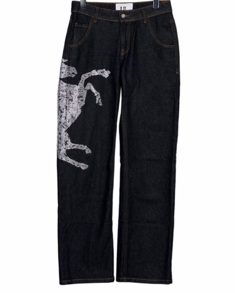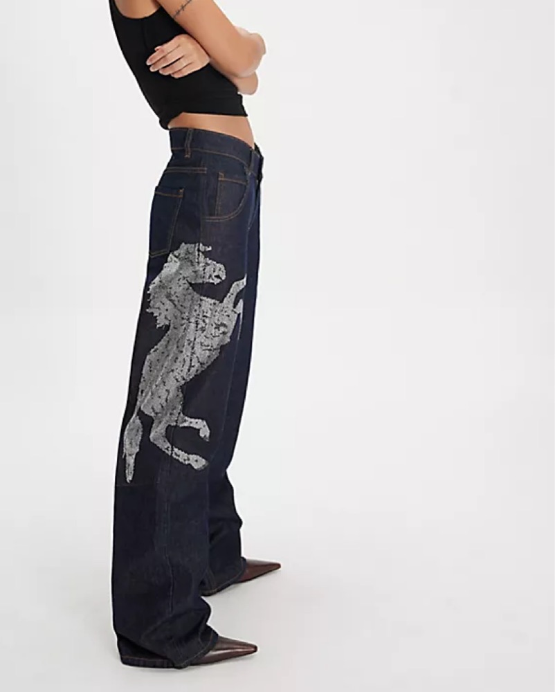 These eye-catching denim trousers feature a bold graphic pattern that adds a unique, fashion-forward flair to your look. Pair them with a simple top and sleek heels for a chic, statement-making ensemble.