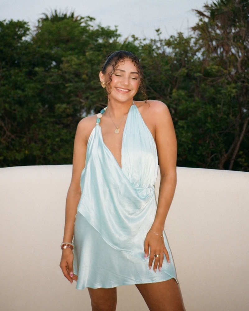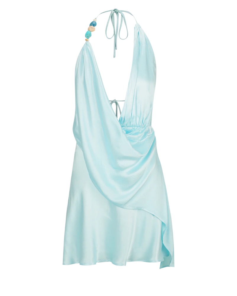 Stone shaped beads at neck drop down to soft cowl draped detail