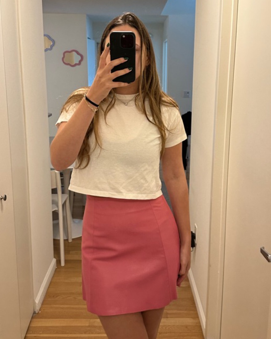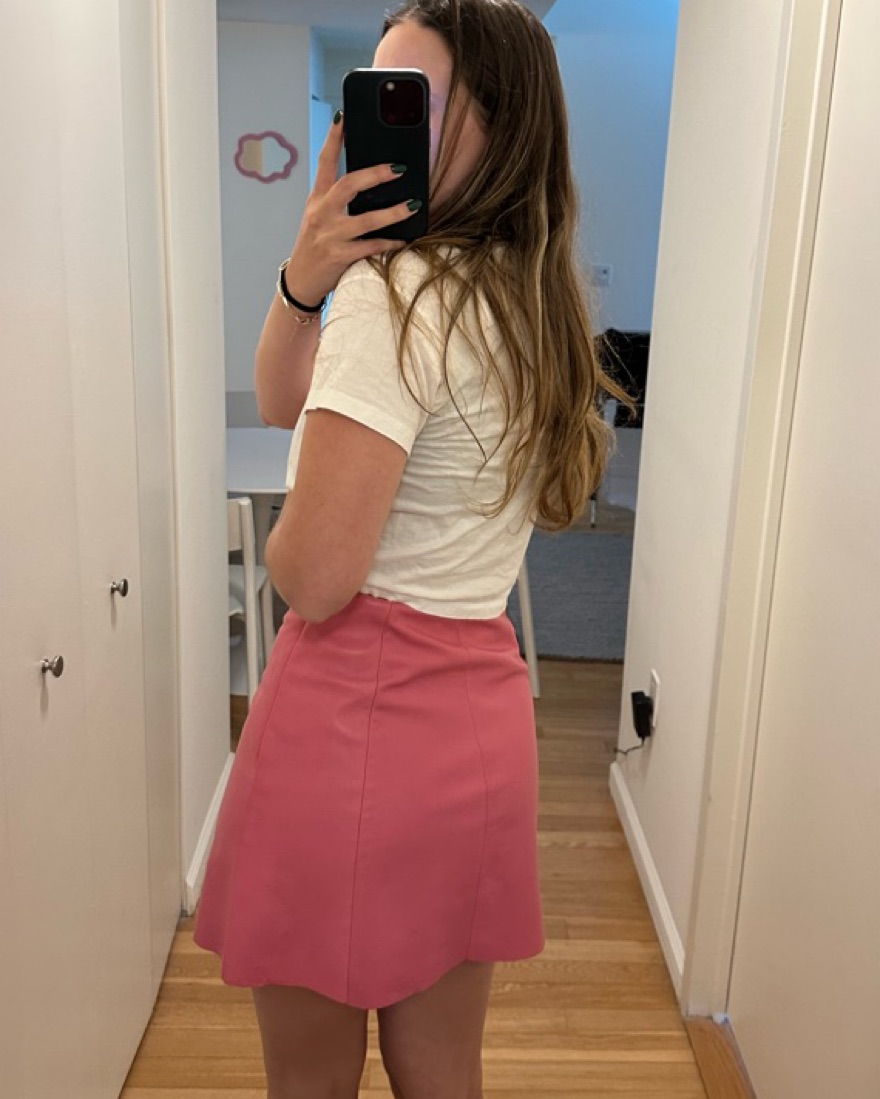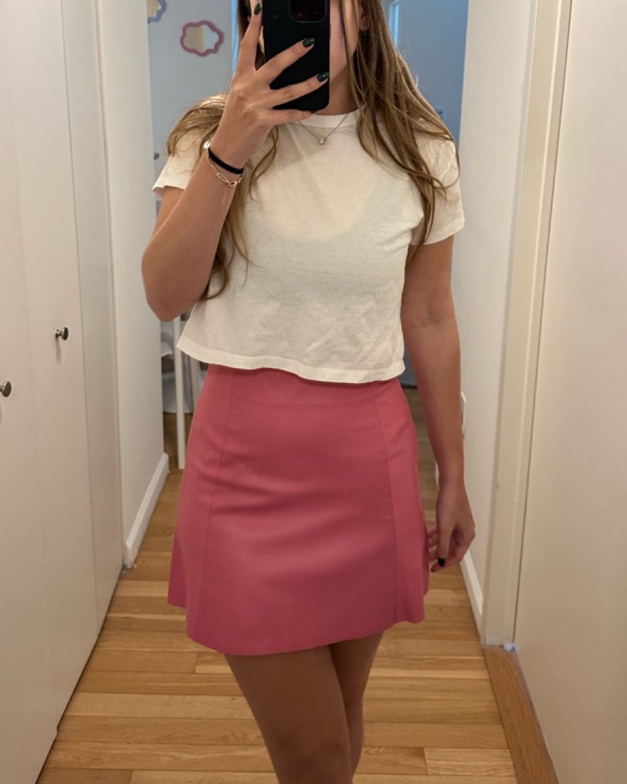 Hot pink leather skirt! leather is very soft abd there is lining in the skirt to make it comortable!