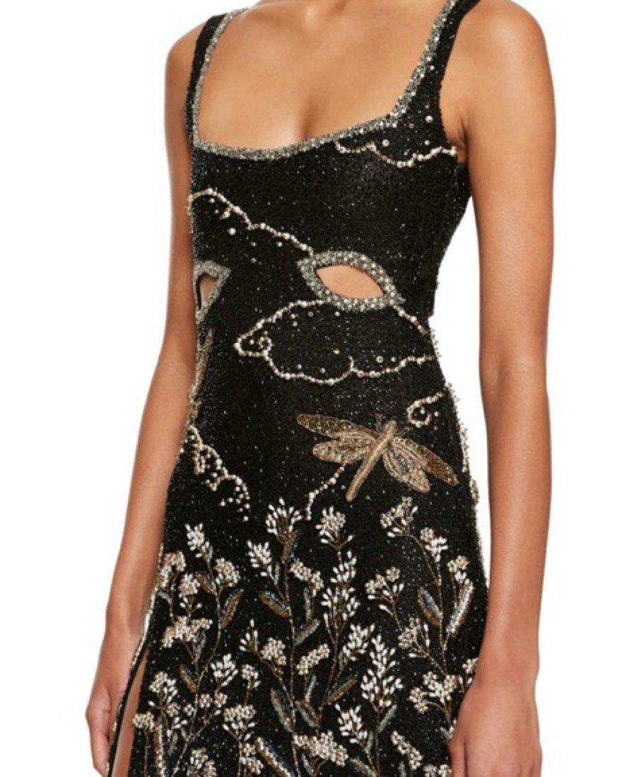 Size xs. Dancing Dragonfly takes you on a flight through the night with golden beaded dragonflies zipping through the garden. The bottom demonstrates blossoming tall stemmed flowers catching the light of the moon. Damages will be charged for beading is delicate.