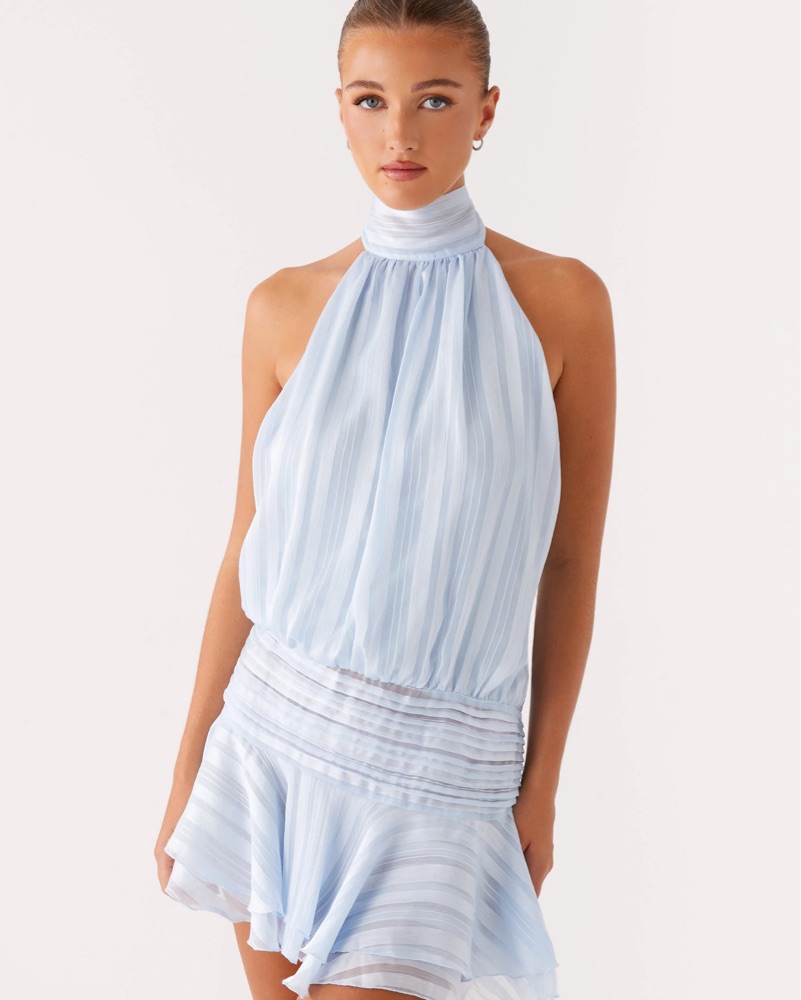 This stunning halter neck mini dress is perfect for a night out or special occasion. The flowing, pleated fabric creates a beautiful, feminine silhouette.