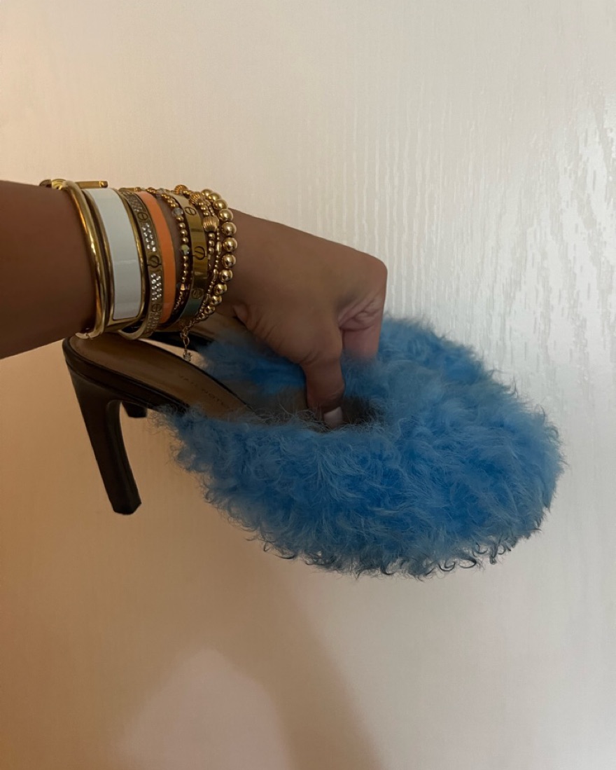 Furry blue heel mule, super comfortable