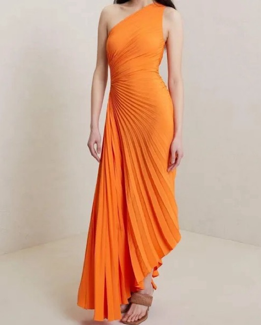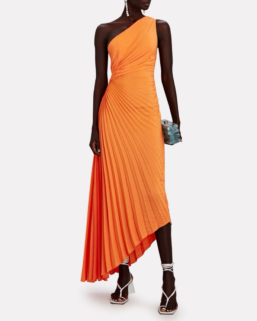The Delfina Dress, a part of A.L.C.'s Signature Collection, is asymmetrically draped and pleated from our signature matte fabric in a citrus hue. This one-shoulder silhouette features a confident side cutout and high-low hem. Worn only once!