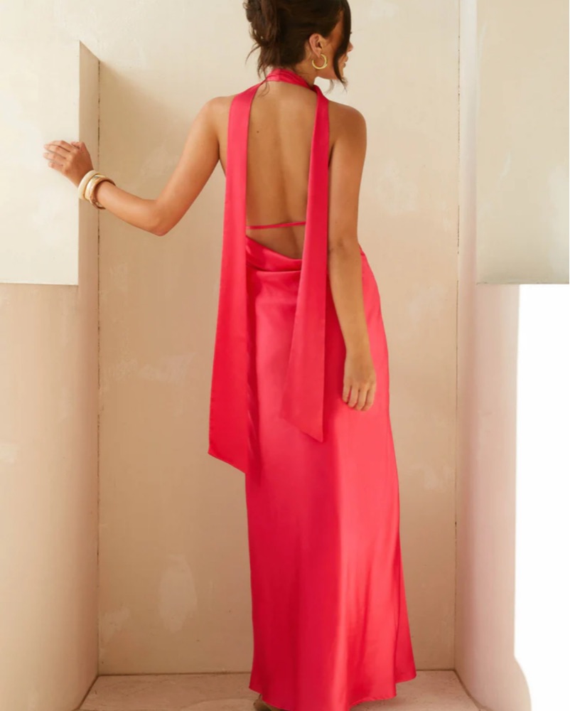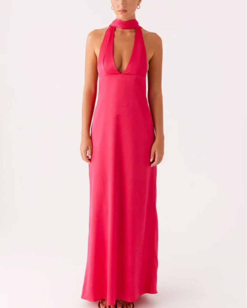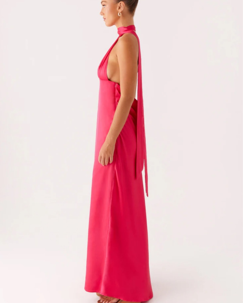 Peppermayo Exclusive - Alicia Satin Halter Maxi Dress - Fuchsia. Fits like a small, medium