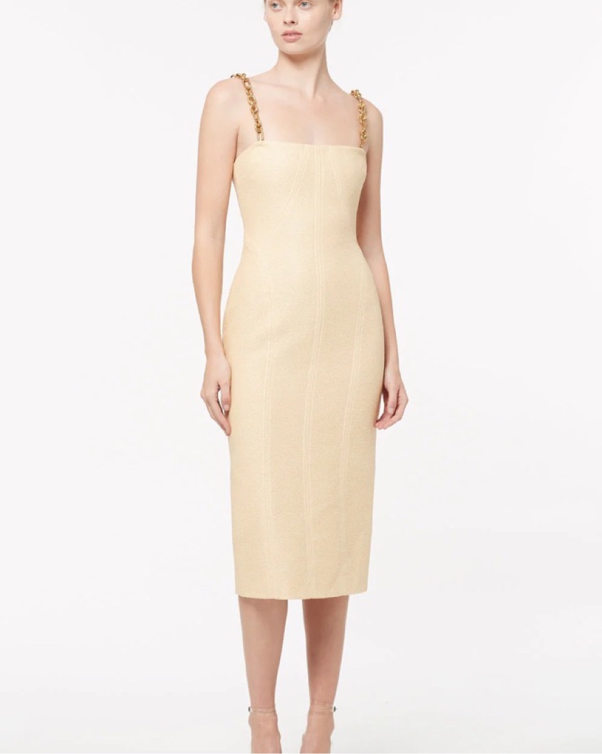 Stretchy— fits Small and Medium. the Neo Classic Midi Dress With Chain is made for your next event. It is designed to accentuate the waist and flatter the female figure. Designed from an Italian Raffia, it features adjustable gold chain straps which are detachable, top stitch panel detailing a