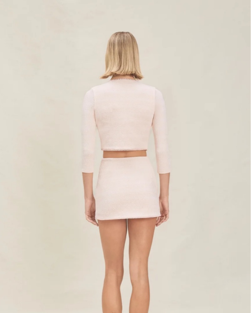 Devon Windsor Mimi Jacket in Sandy Tweed. As seen on Alexandra Saint Mleux. The perfect jacket to complete a classy outfit. The Mimi is a fitted, cropped jacket with front pockets and beaded trim detail at edge.