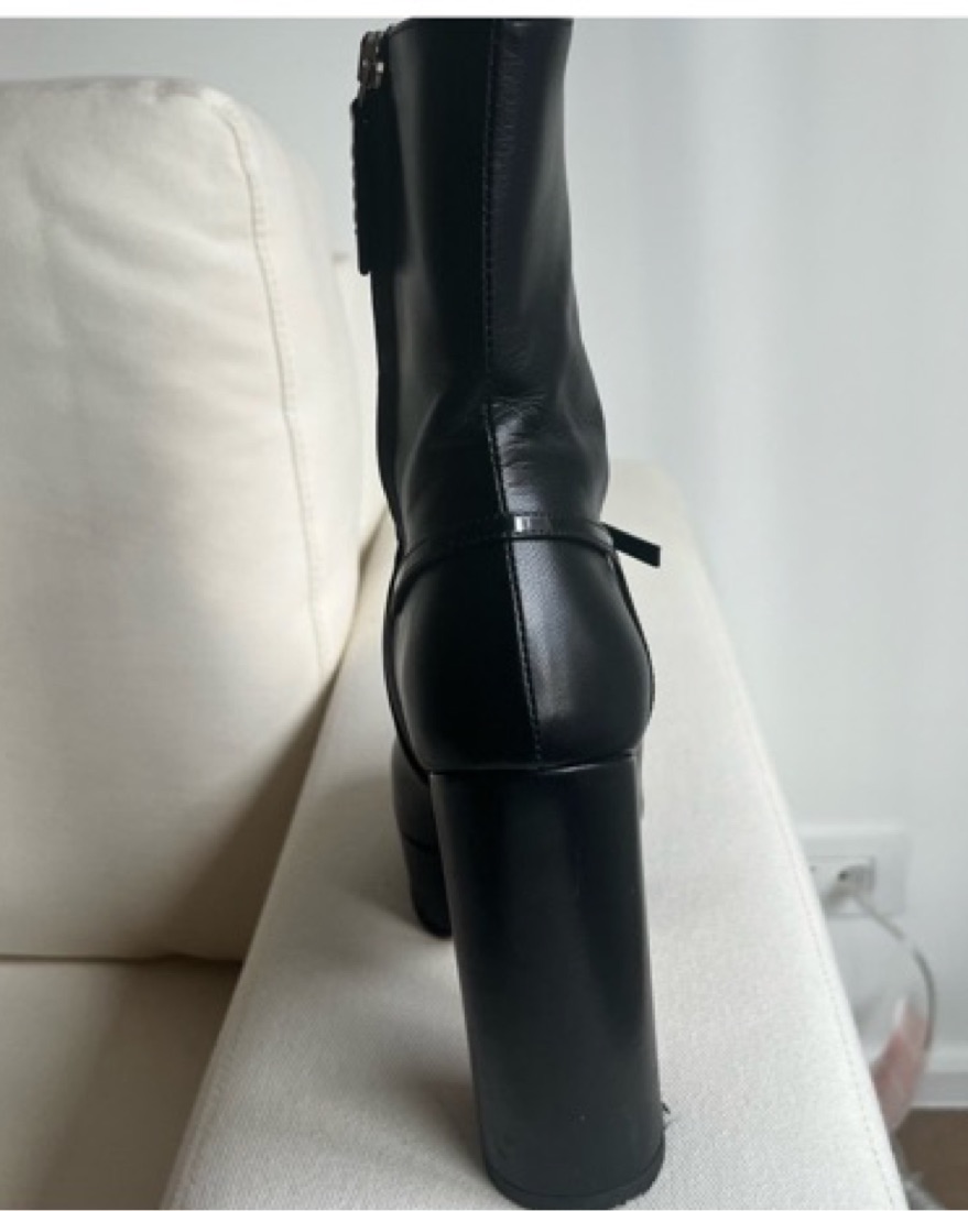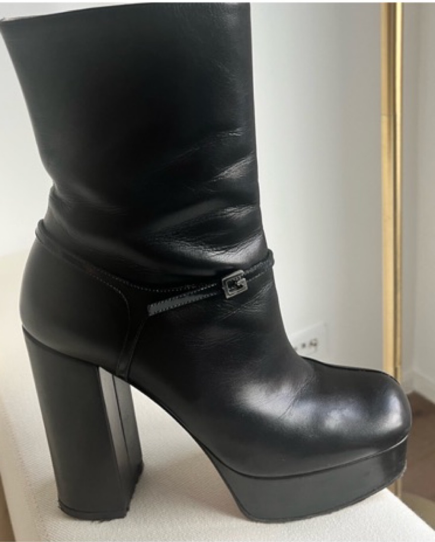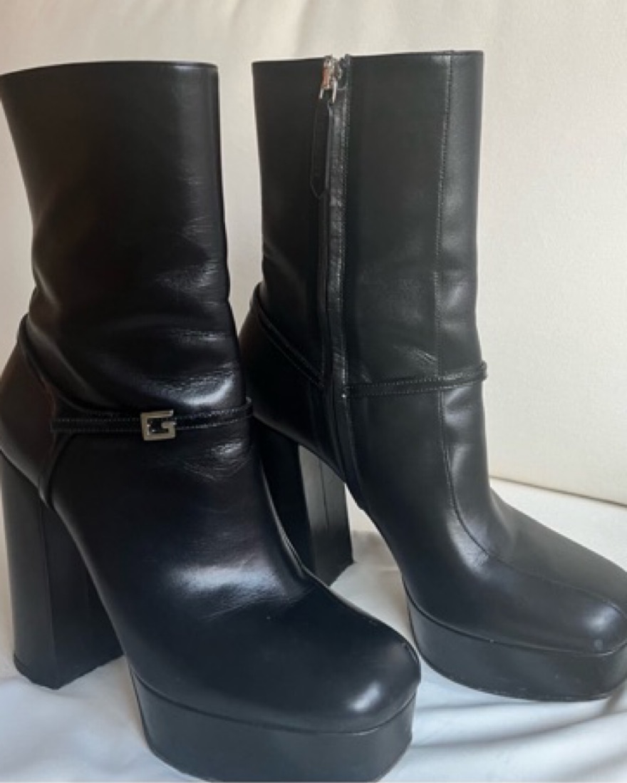 Sold out . Platform 70s-style leather bootie with a patent harness and blocky monogram buckle. Genuine buffed leather boots in black. Square toe. 1.5” platform, 4.75” heel. Felt on heel to prevent wear.