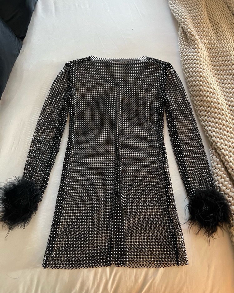 See through black rhinestone dress with fuzzy cuffs attached. Also have the black strapless dress to wear under if you’d like that included.