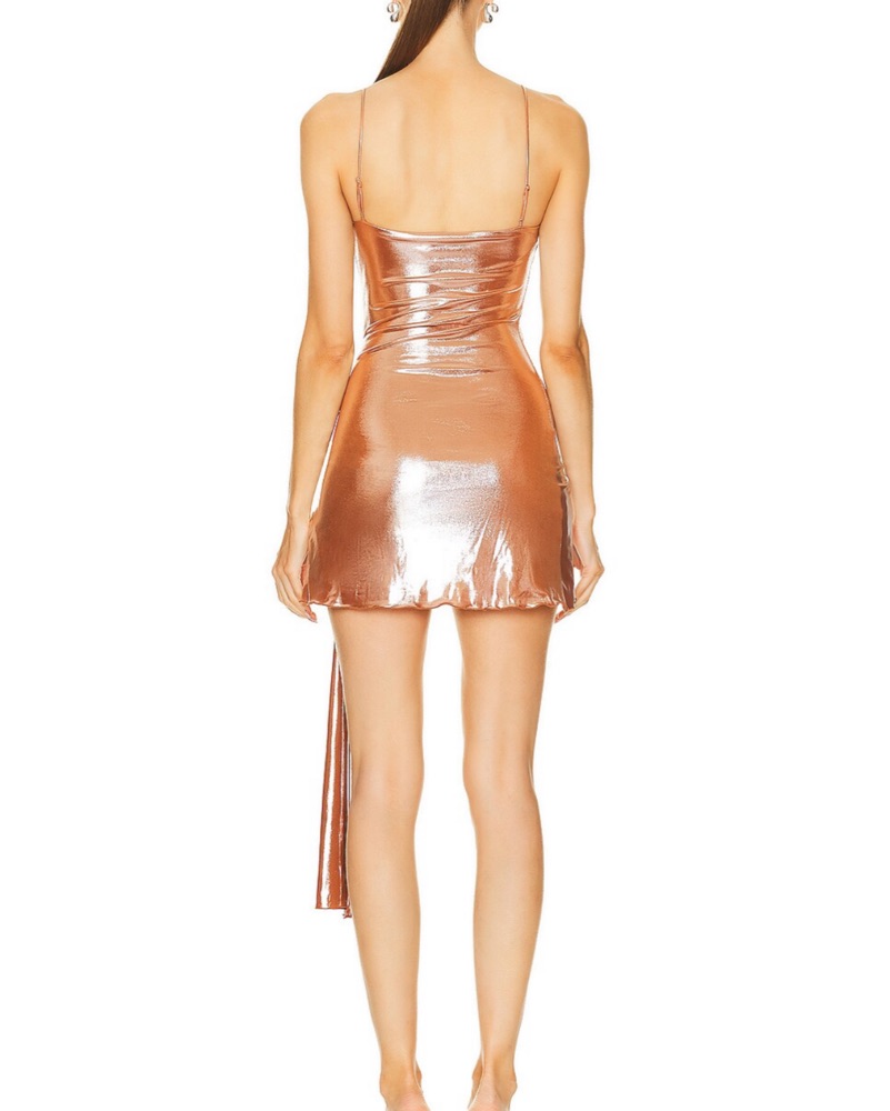 Metallic/wet look rose gold dress. Stunning color, so flattering, and has adjustable straps!