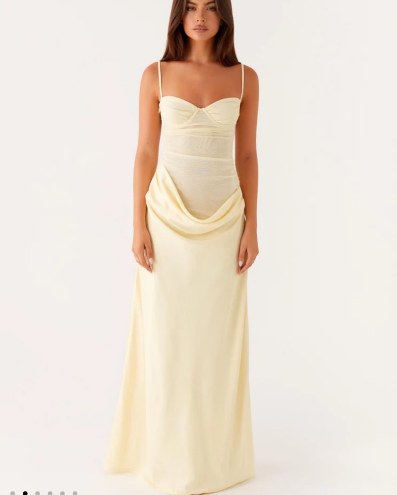 This stunning satin maxi dress is perfect for a formal event or elegant evening out. The draped fabric and flattering silhouette create a sophisticated look. Size 6 but runs small fits like a 4