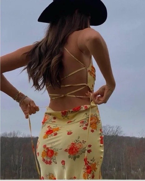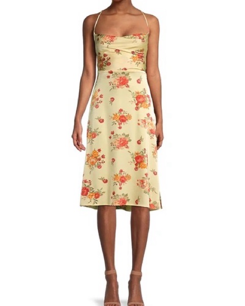Yellow dress with intricate tie back and orange and red floral pattern. In great condition