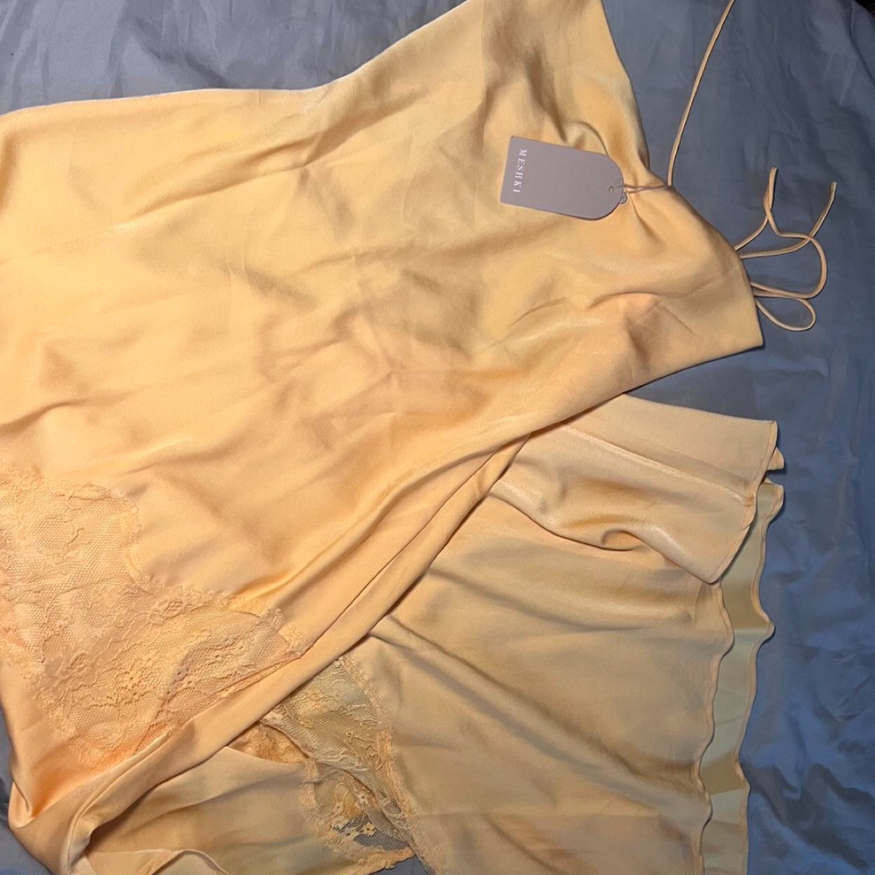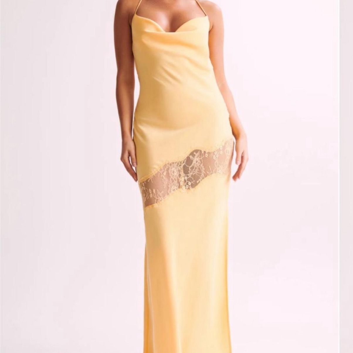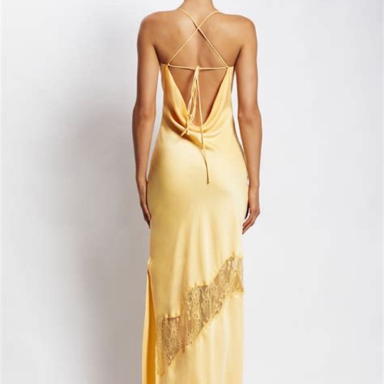 Meshki Formal Satin Lemon Yellow Maxi Dress with Lace Detail. New With Tags!