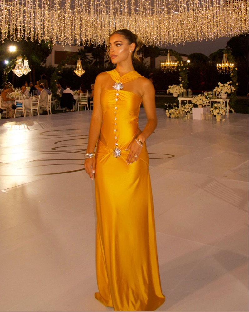 Gorgeous wedding guest dress. Paco rabanne dress dupe. It’s an XS I’m 5’3 wearing 5 inch heels in this photo