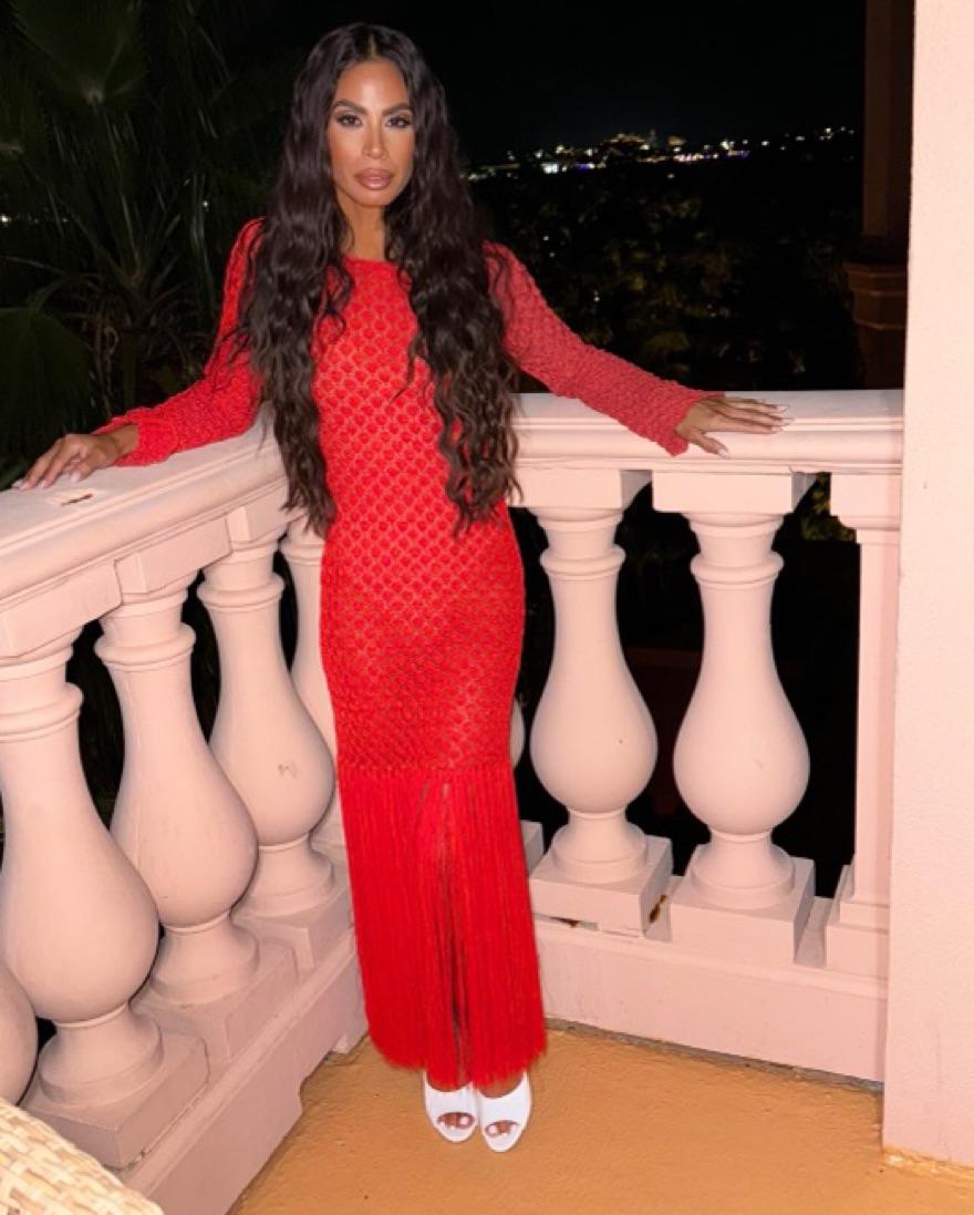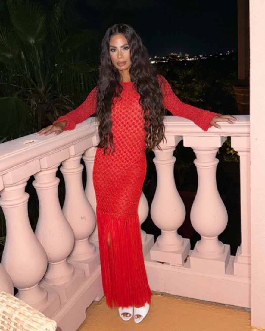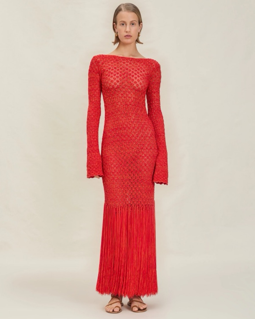 The Callista is a long-sleeve, open back maxi dress with a double row detail of 20” fringe at hem