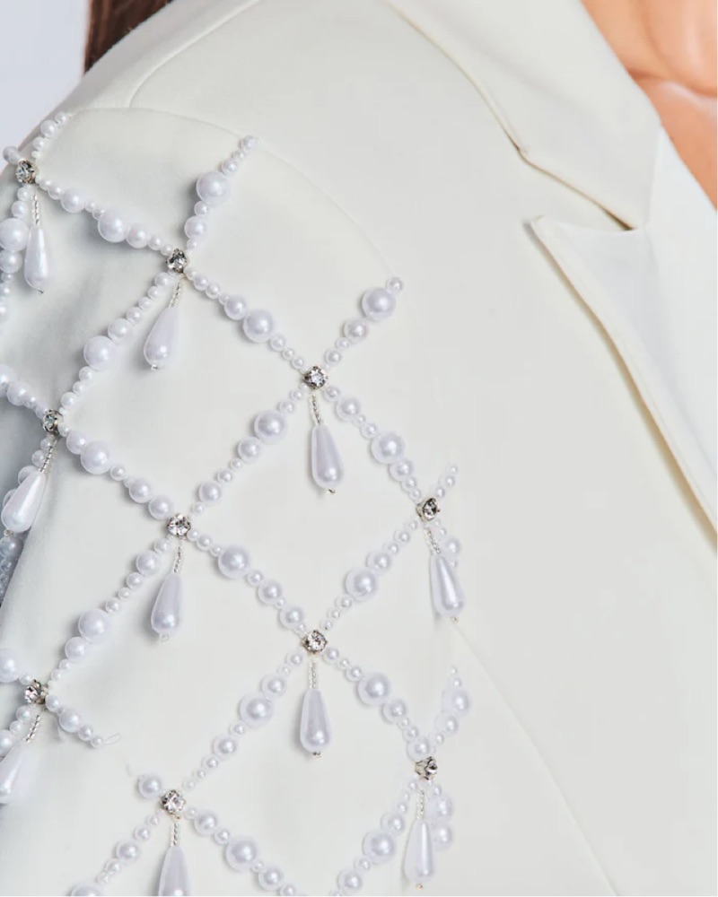 I wear this blazer with a pair of white shorts to give the blazer dress effect. This classic suit jacket silhouette is updated with dramatic pearl-adorned sleeves. The style is completed with side pockets and a front button closure