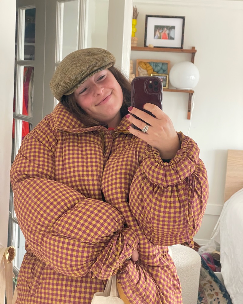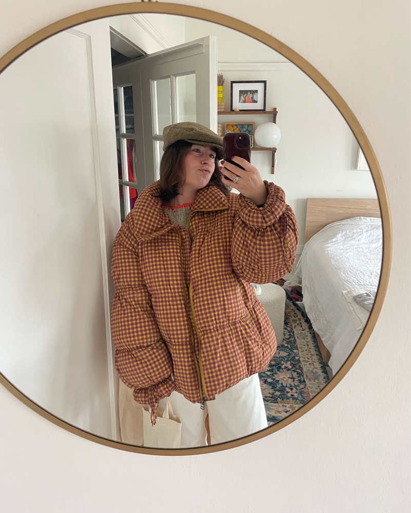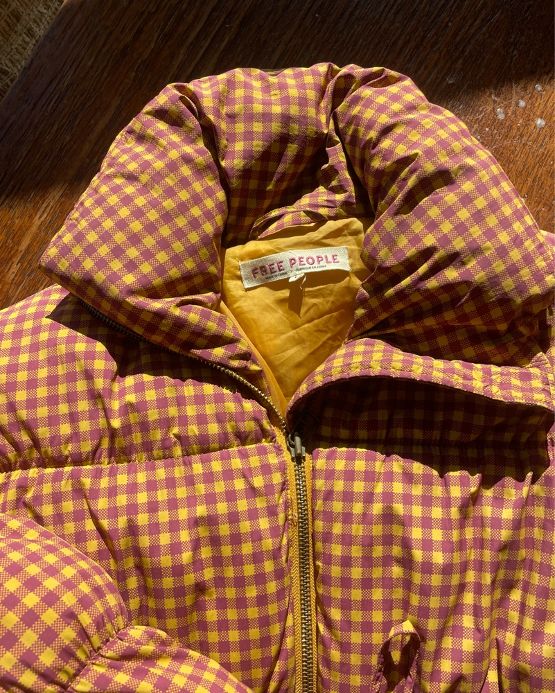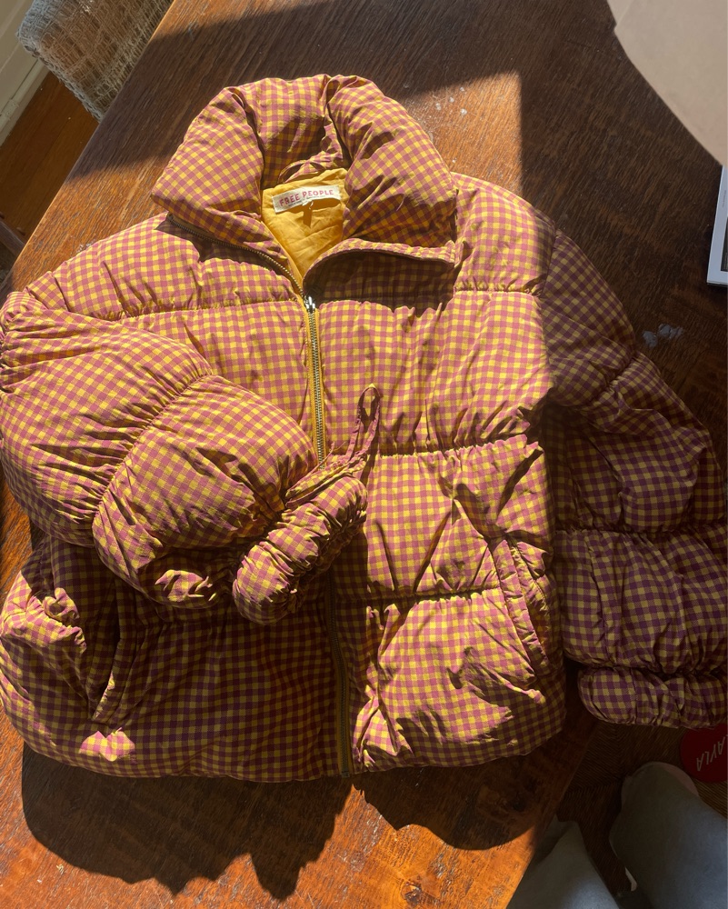 I get so many compliments on this jacket!! Out of production with free people. Super lightweight and not a burden to wear or carry around, fits loose at the hips and does not hug. Puffer style balloon sleeves with tie details at cuffs. Handwash only - price reflected