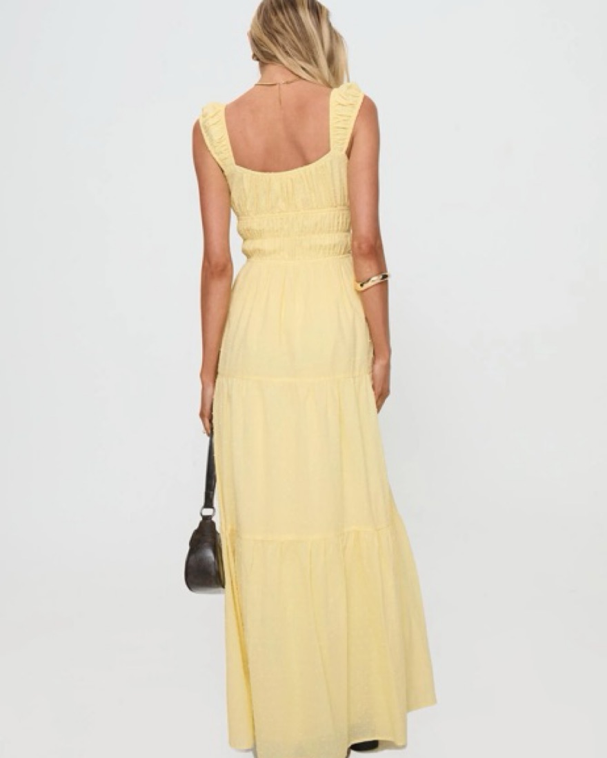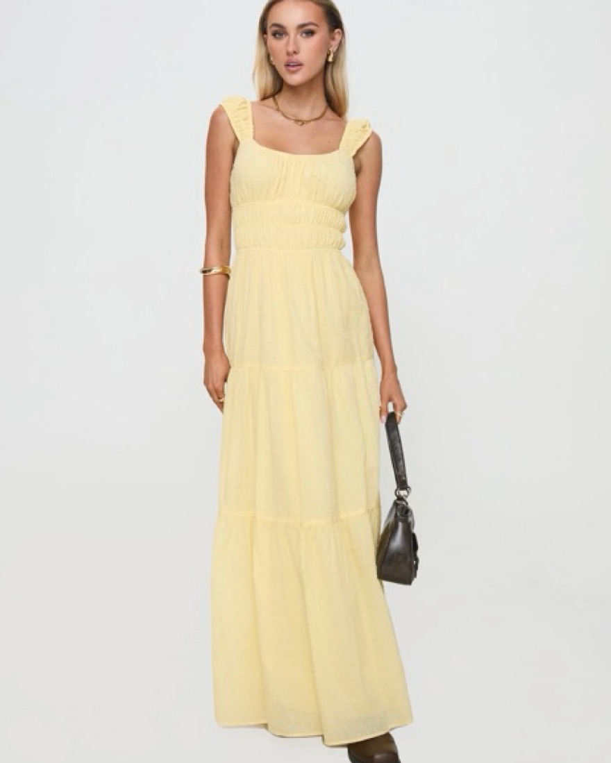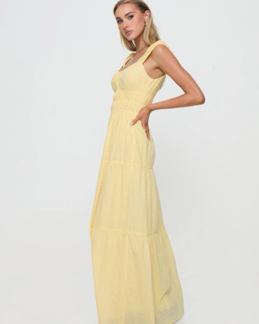 Yellow maxi dress with scooped neckline and elasticated bust and straps in a textured material. Perfect for a brunch, winery and also got a ton of compliments at work!