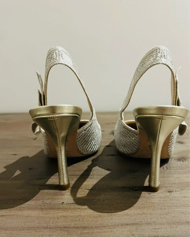 These stunning slingback heels elevate any outfit with their sophisticated style. Perfect for special occasions or a night out on the town. 4 inch heel, size 37. Please note these are gold with strass.
