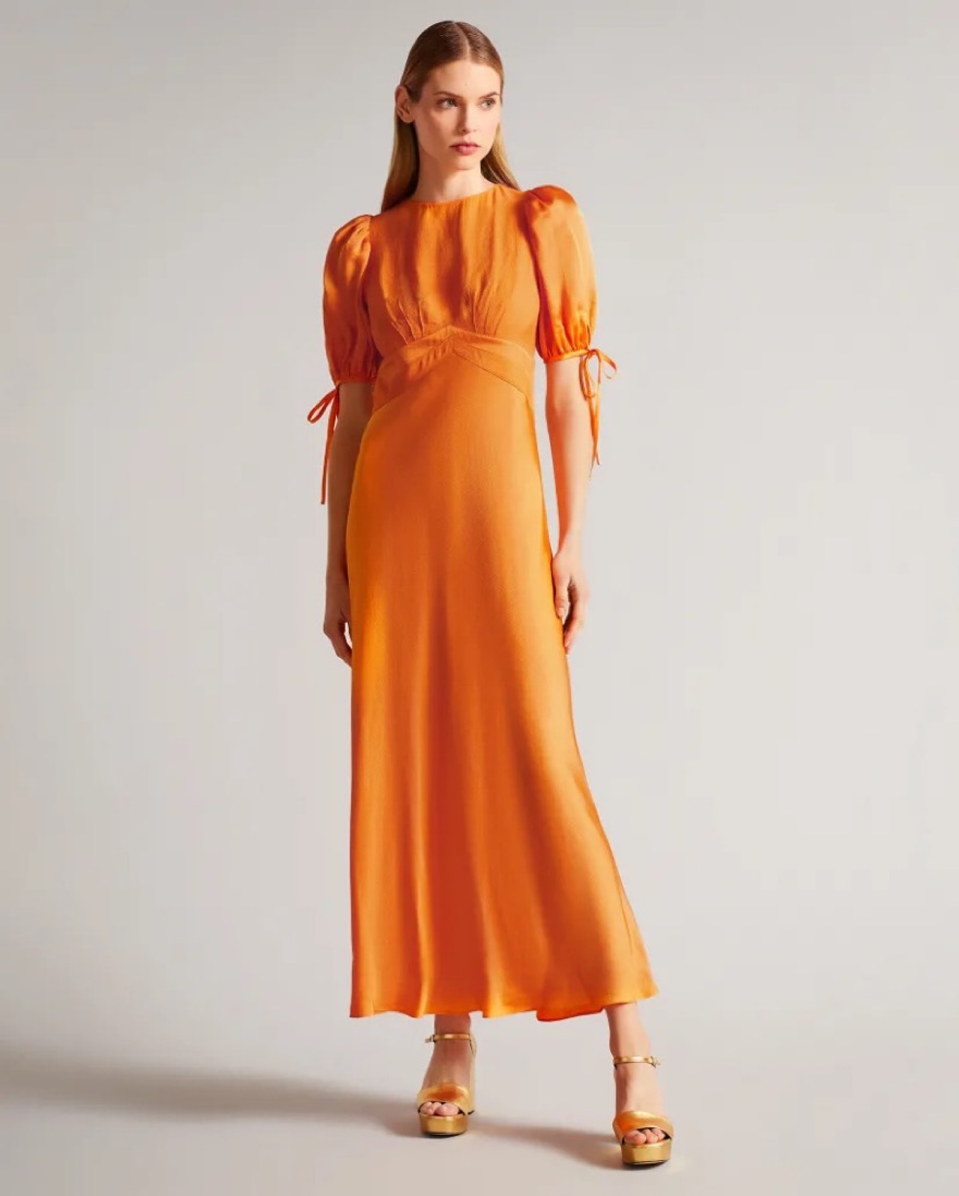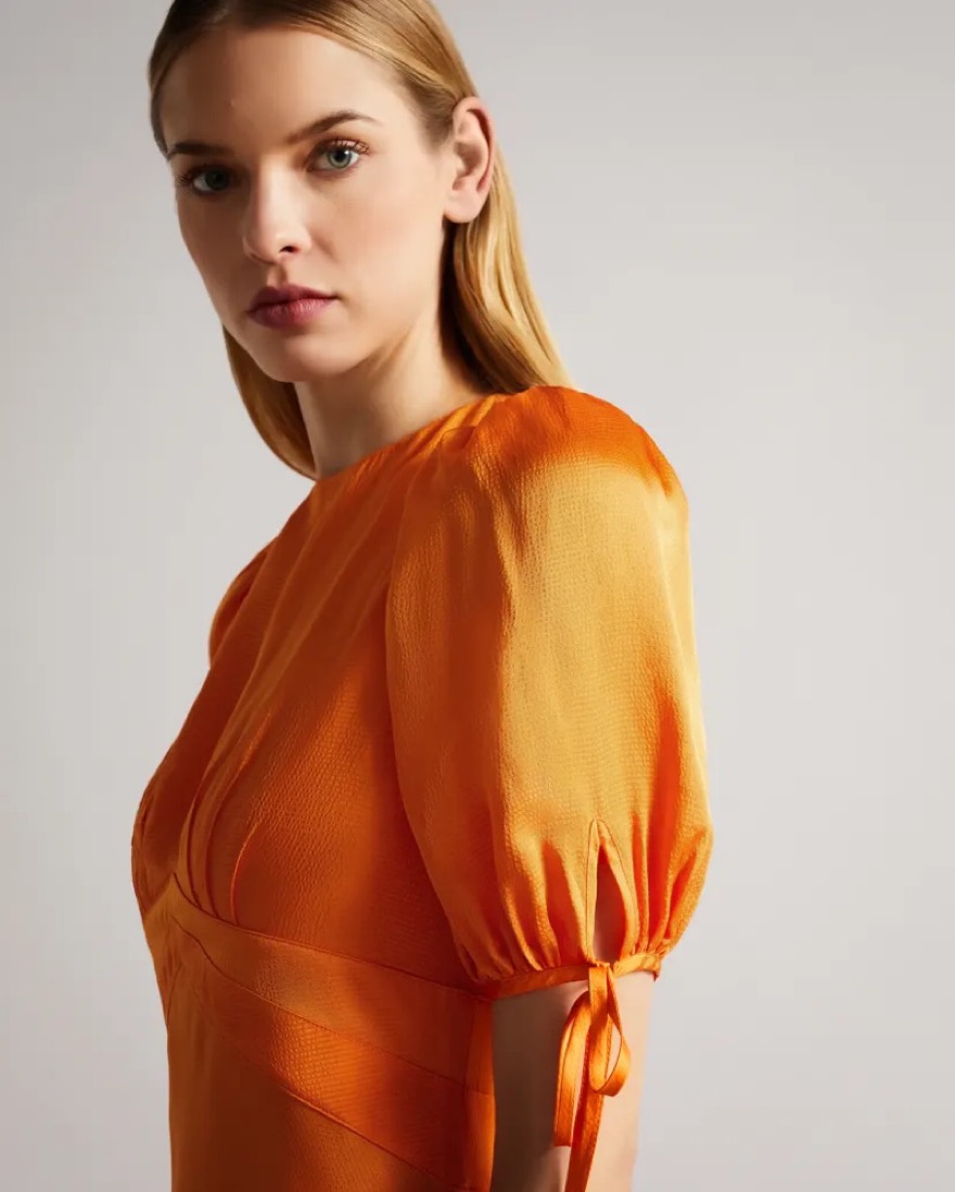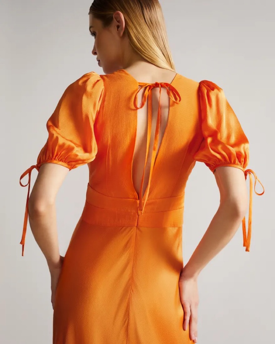This orange Ted Baker dress is satin with an open tied back. It has never been worn!