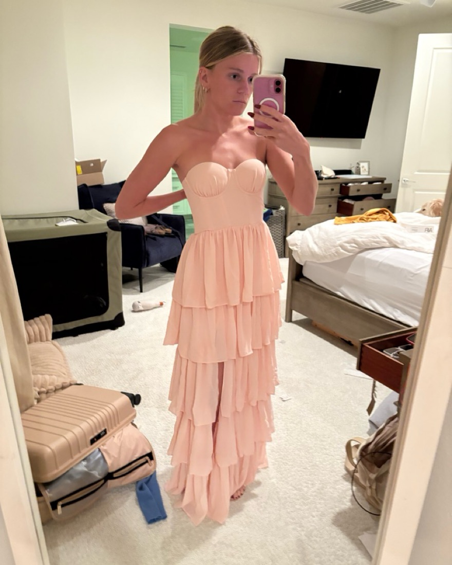 Tiered ruffle gown with a split in the leg. Corset waist. Makes you look tiny. Never worn!