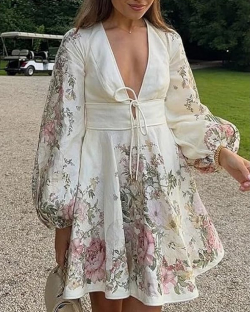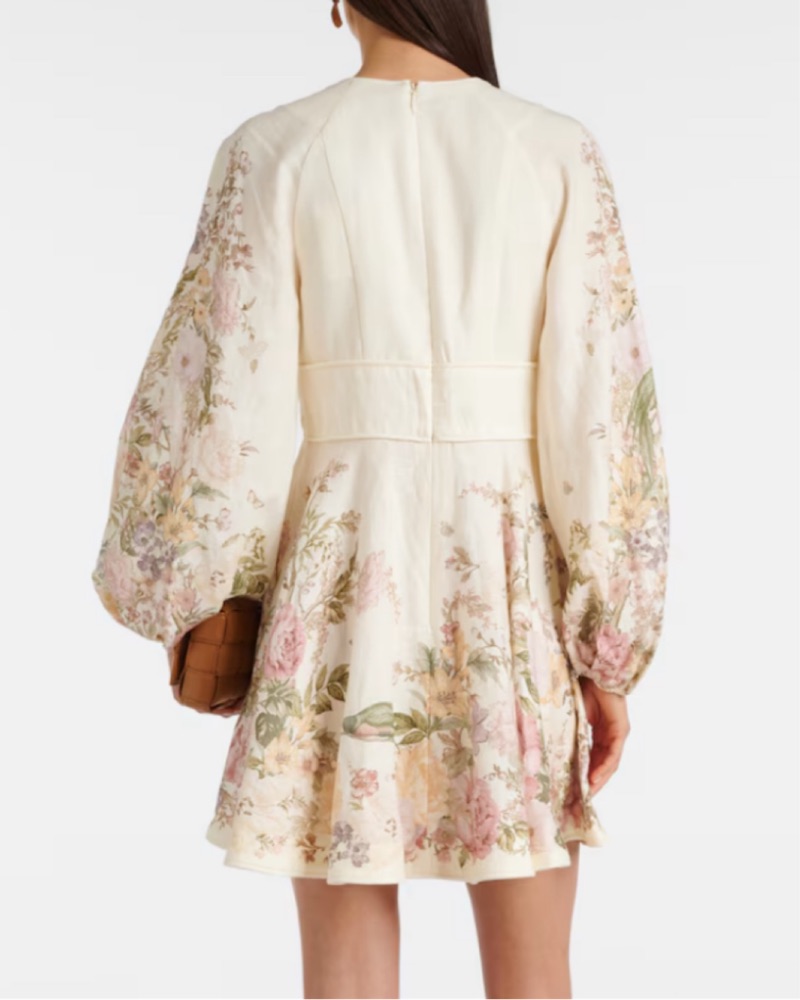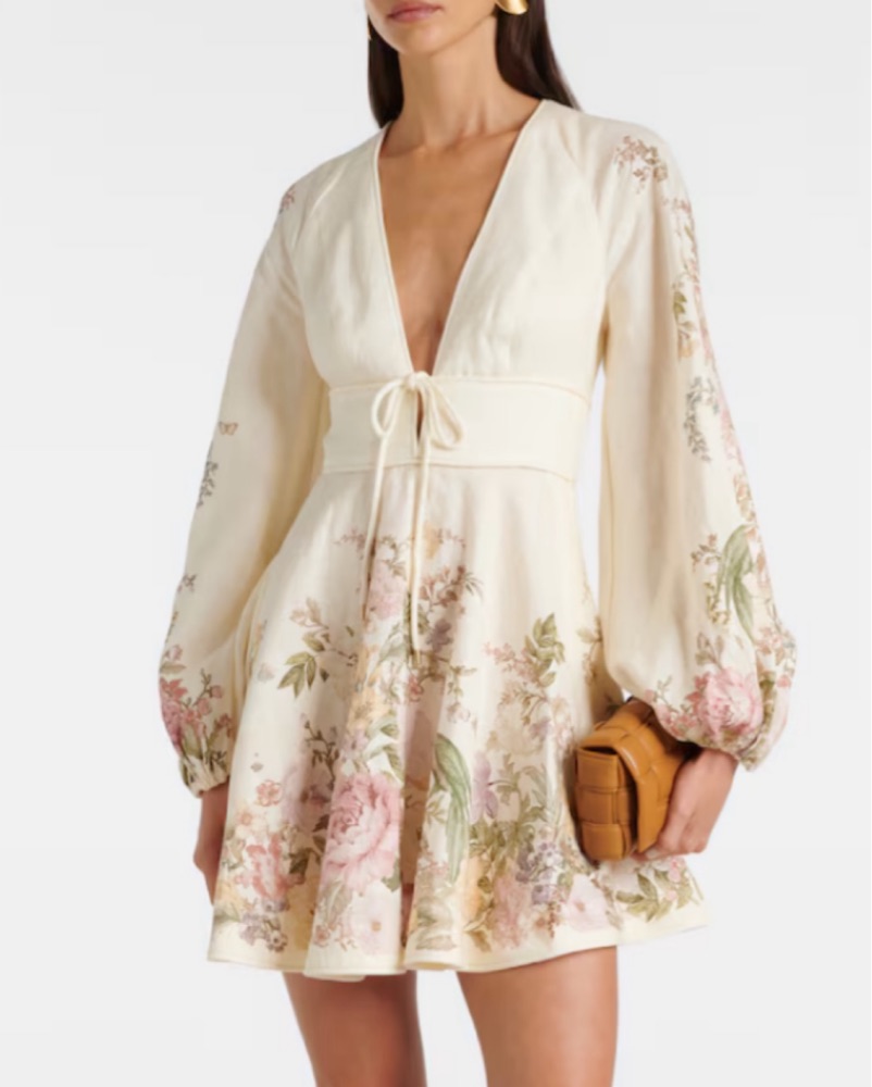 The Waverly Plunge Mini Dress in Cream Floral from Zimmermann's Summer Swim 2024 Collection. A linen mini dress featuring a plunging neckline and bow detail, finished with a full mini skirt.