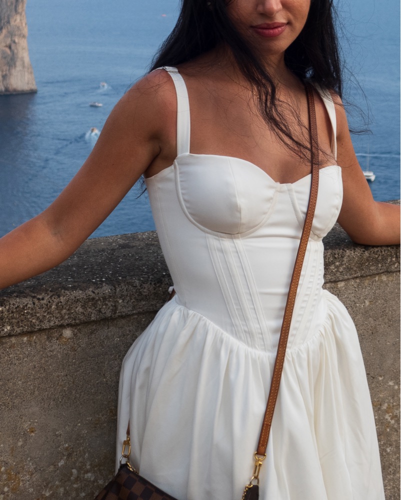 White Corset Midi Sundress, size XS with a corseted bodice that defines the silhouette and it laces up beautifully to the back. The sweetheart neckline has underwired cups so no bra is needed. Regular cup. Please take care since its white and is dry clean only🩵