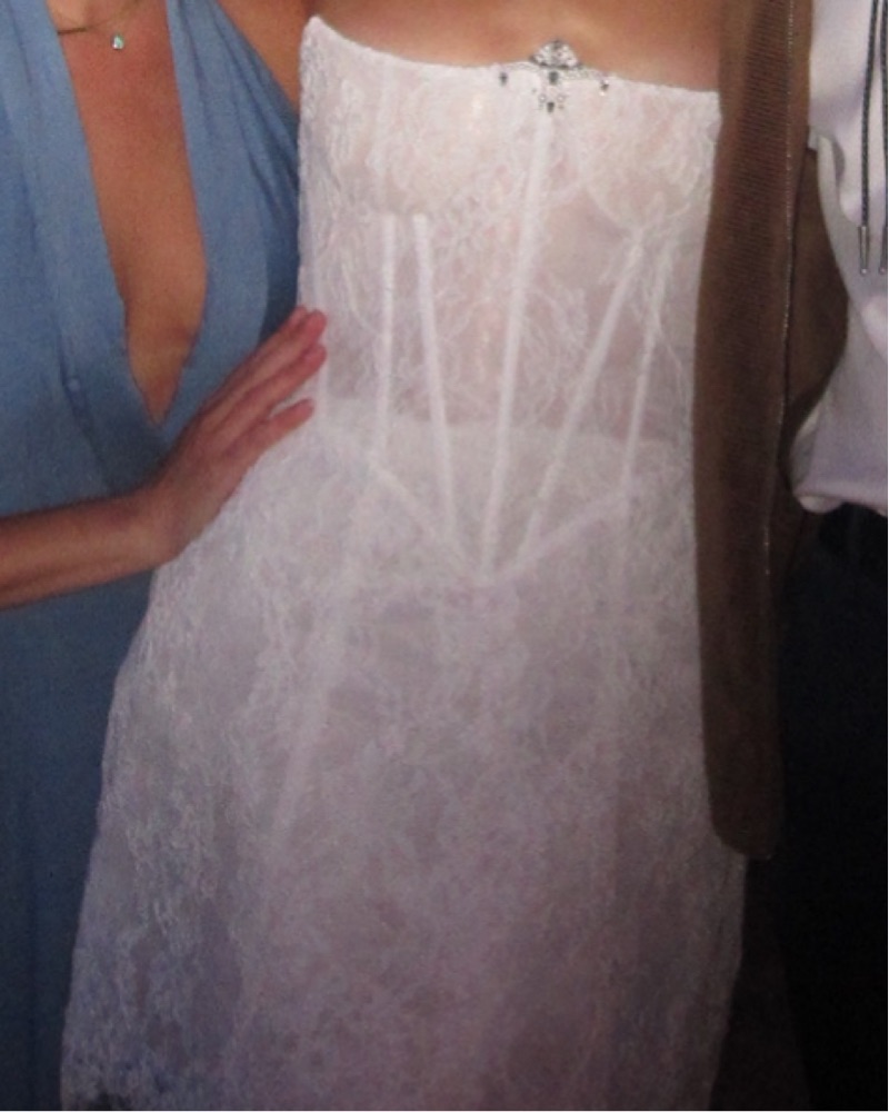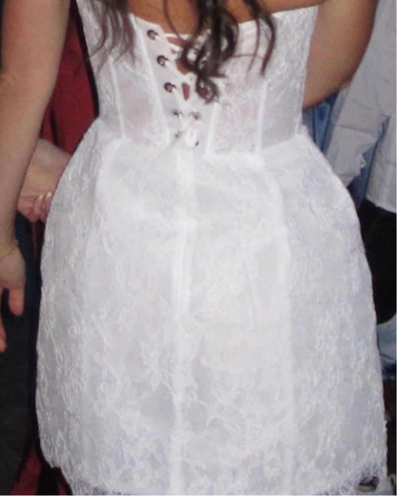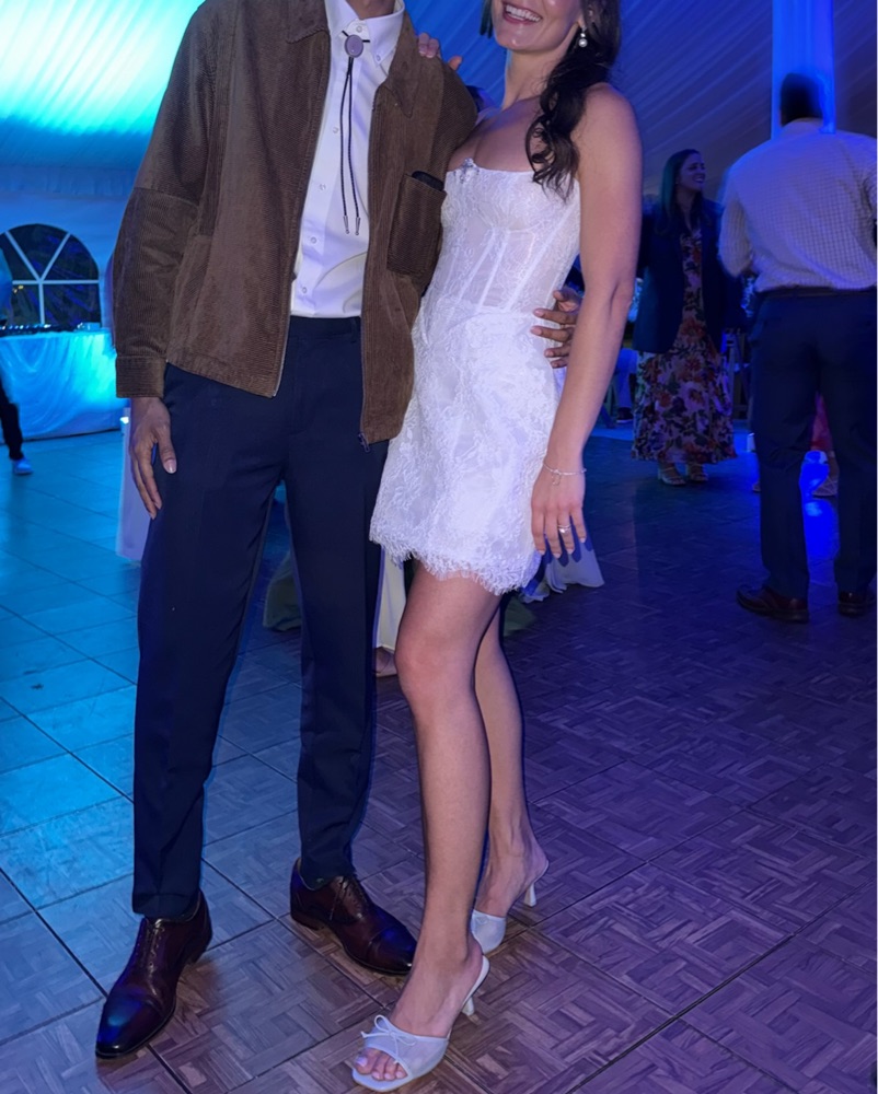 This stunning white lace mini dress is the PERFECT Reception Dress to impress. Easy to tighten. No straps included (broken, but the dress stays up very well without). Size A/small B cup for reference. The underwear line is not built in, those were personal shorts :)