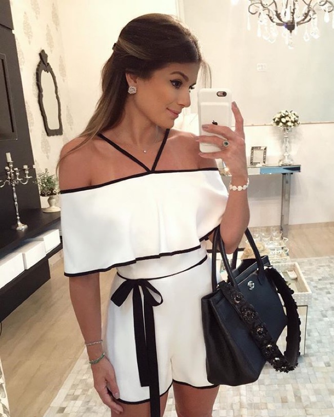 Alexis Kristin Off The Shoulder Black and White Ruffle Sleeve Shoulder Strap Belted Romper