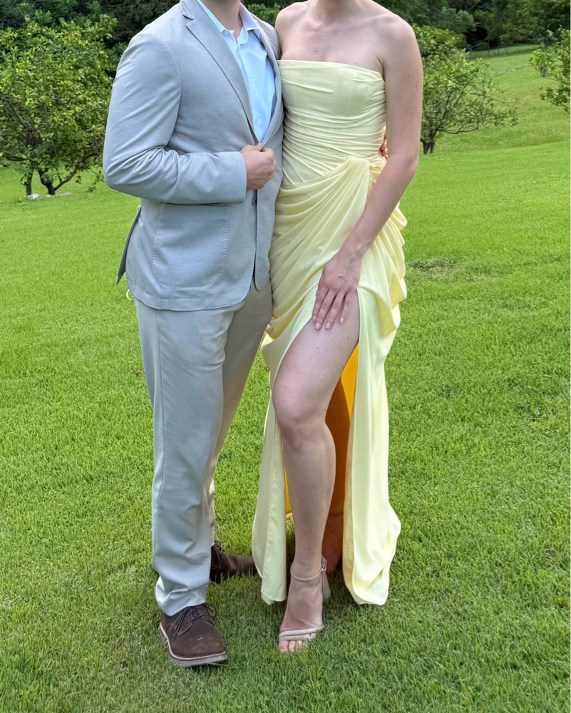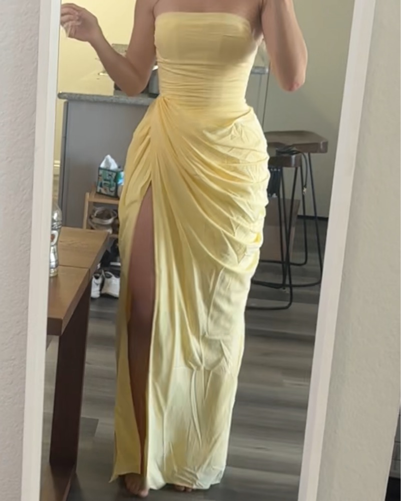 This elegant butter yellow maxi dress is perfect for a spring wedding, prom, or black tie event. Price includes dry cleaning costs.