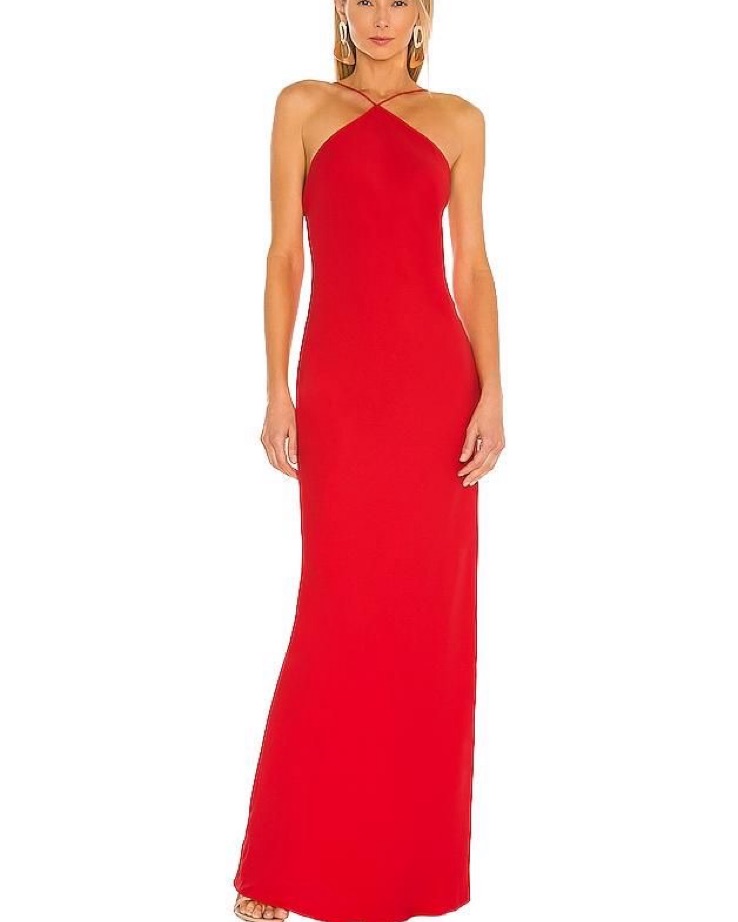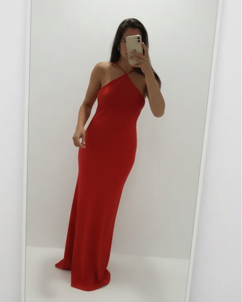 This elegant red halter maxi dress is perfect for a formal event or special occasion. The sleek, figure-flattering silhouette and vibrant color create a sophisticated and head-turning look.