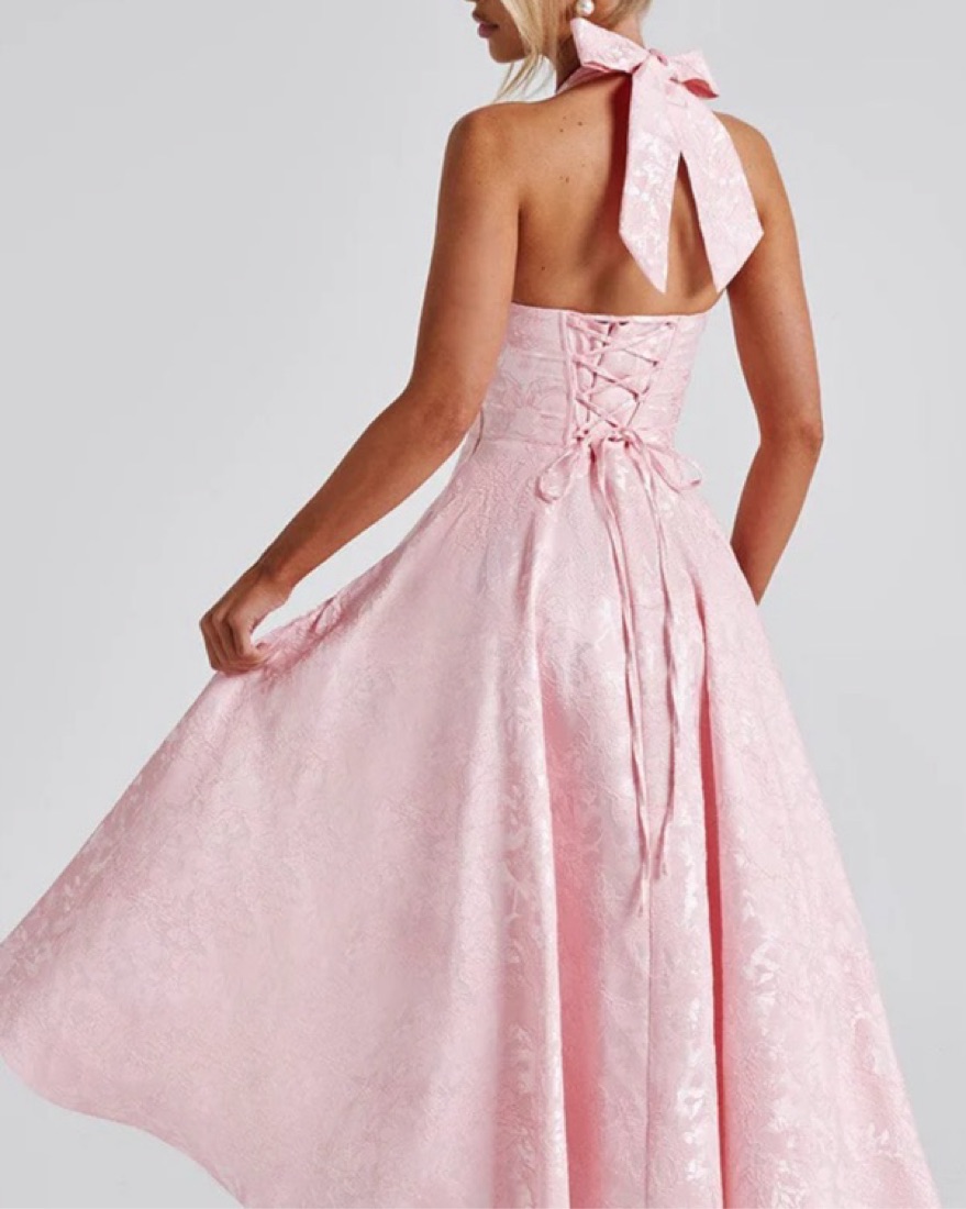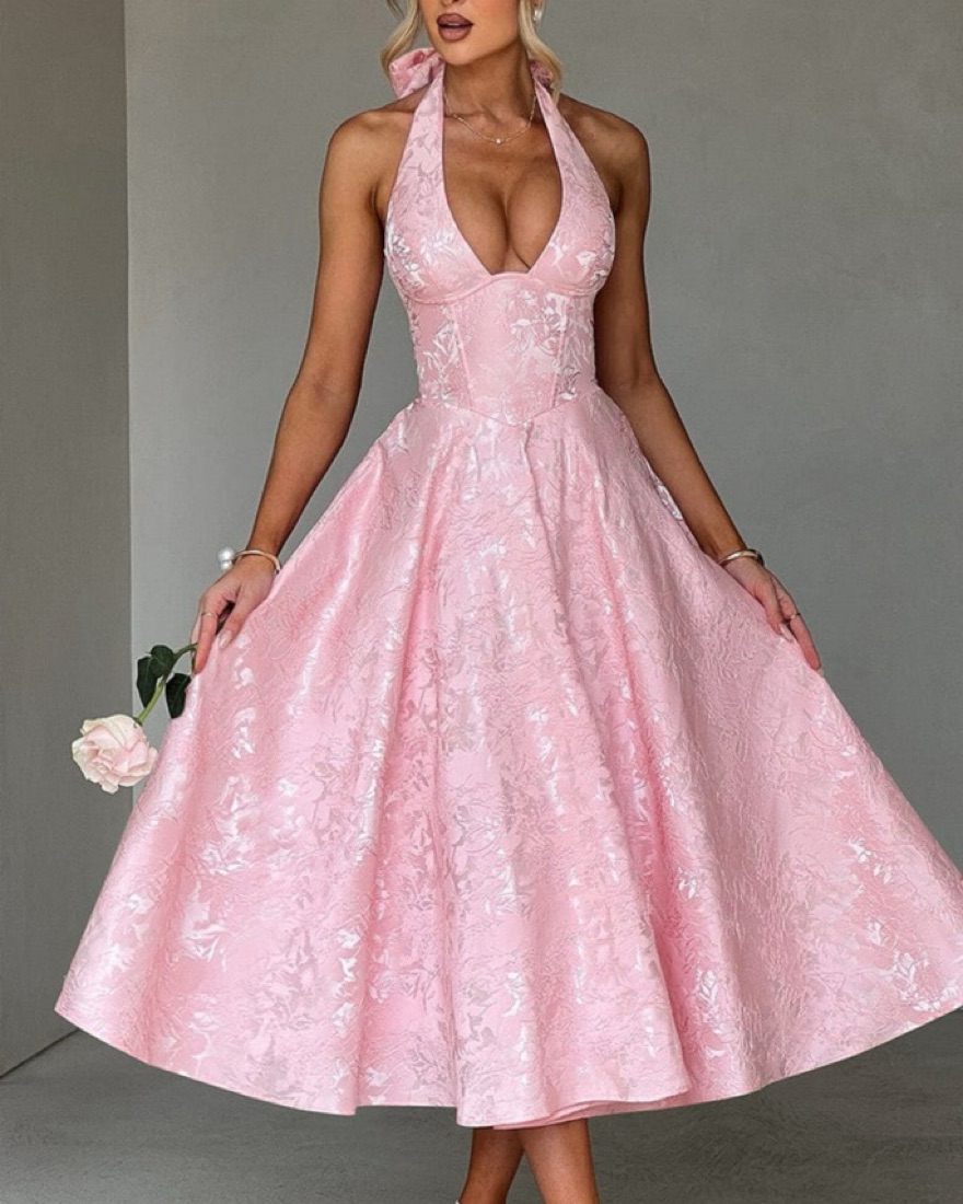Floral midi pink dress, it features a full midi skirt made with tulle for added volume, and a super cinched bodice with boning to snatch the waist. With a plunge halter neckline and lace up back for your perfect fit!
