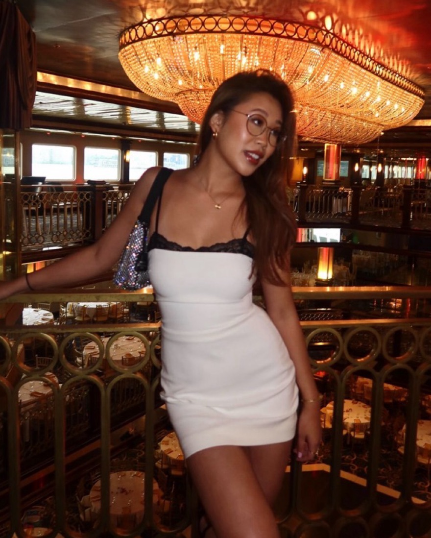 white stretchy fitted dress with black lace trim and adjustable straps.
