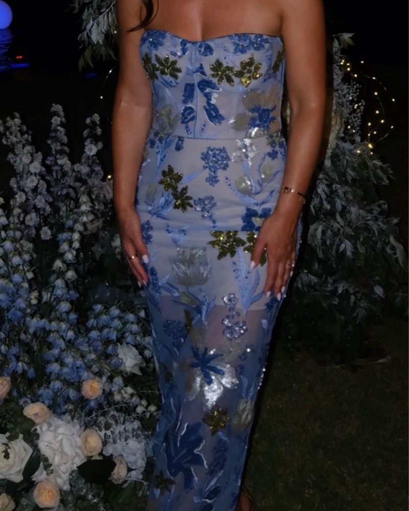 Bronx and Banco Dahlia Maxi Dress in baby blue. Size small. Was hemmed I am 5 foot 3 and wore 4 inch heels. Got so many compliments. Perfect for weddings and special occasions. Originally $880