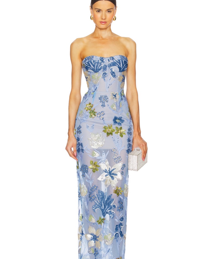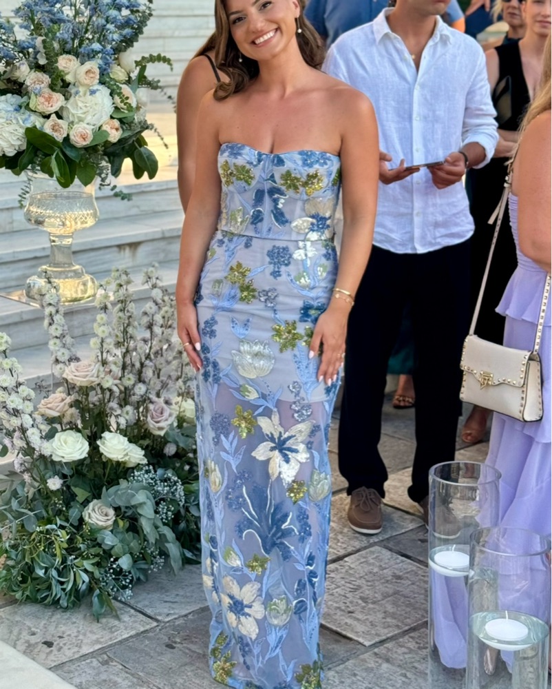 baby blue, maxi dress, floral pattern, hemmed, special occasions, wedding guest, elegant, bridesmaid
